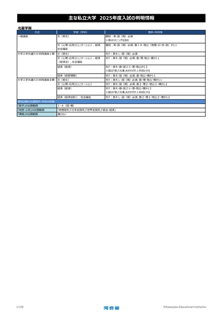 北星学園一般選抜方式大学入学共通テスト利用選抜Ⅰ期大学入学共通テスト利用選抜Ⅱ期主な私立大学2025年度入試の判明情報学部(学科)文(英文)文(心理・応用コミュニケーション)、経済、社会福祉文(英文)文(心理・応用コミュニケーション)、経済(経済法)、社会福祉経済(経済)経済(経営情報)文(英文)文(心理・応用コミュニケーション)経済(経済)個別:英・国(現)必須※英はリスニングを含む教科・科目等個別:英・国(現)必須、数ⅠA・地公(地理・日・世・政)から1共テ:英RL・国(現)必須共テ:英R・国(現)必須、数・理・地公・情から1共テ:英R・数・国2※・理・地公から3※国は「現」「古漢」をそれぞれ1科目とする共テ:英R・国(現)必須、数・地公・情から1共テ:英RL・国(現)必須、数・理・地公・情から1共テ:英R・国(現)必須、数2・理2・地公2・情から2共テ:英R・数・国2※・理・地公・情から3※国は「現」「古漢」をそれぞれ1科目とする経済(経済を除く)、社会福祉共テ:英RL・国(現)必須、数2・理2・地公2・情から2個別試験の出題教科・科目の詳細「数学」の出題範囲「地歴・公民」の出題範囲「情報」の出題範囲Ⅰ・A(図・場)「地理探究」「日本史探究」「世界史探究」「政治・経済」課さない1/129©KawaijukuEducationalInstitution.
