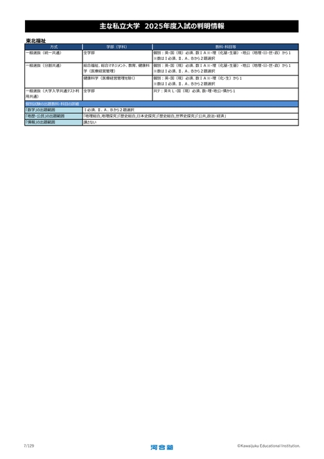主な私立大学2025年度入試の判明情報東北福祉方式一般選抜(統一共通)全学部学部(学科)教科・科目等個別:英・国(現)必須、数ⅠA※・理(化基・生基)・地公(地理・日・世・政)から1※数はⅠ必須、Ⅱ、A、Bから2題選択一般選抜(分割共通)総合福祉、総合マネジメント、教育、健康科学(医療経営管理)個別:英・国(現)必須、数ⅠA※・理(化基・生基)・地公(地理・日・世・政)から1※数はⅠ必須、Ⅱ、A、Bから2題選択健康科学(医療経営管理を除く)一般選抜(大学入学共通テスト利用共通)全学部個別:英・国(現)必須、数ⅠA※・理(化・生)から1※数はⅠ必須、Ⅱ、A、Bから2題選択共テ:英RL・国(現)必須、数・理・地公・情から1個別試験の出題教科・科目の詳細「数学」の出題範囲「地歴・公民」の出題範囲「情報」の出題範囲Ⅰ必須、Ⅱ、A、Bから2題選択「地理総合,地理探究」「歴史総合,日本史探究」「歴史総合,世界史探究」「公共,政治・経済」課さない7/129©KawaijukuEducationalInstitution.
