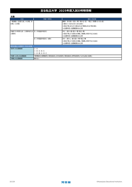 主な私立大学2025年度入試の判明情報文教方式学部(学科)教科・科目等一般選抜(全国入試、A日程、B日程、C日程)共通テスト利用入試(3教科または2教科)文(中国語中国文)文(中国語中国文)を除く個別試験の出題教科・科目の詳細「数学」の出題範囲Ⅰ・AⅠ・Ⅱ・A・B・CⅠ・Ⅱ・Ⅲ・A・B・C個別:英・数※・国※・理(物・化・生)・地公(地理・日・世・政)※数はⅠAまたはⅡCまたはⅢC※国は「現」または「古漢」または「現漢」または「現古漢」※出題科目・出題範囲のみ公表共テ:英R・数・国※・理・地公・情※国は「現」と「古漢」を分離して換算し判定することもある※出題科目・出題範囲のみ公表共テ:英RL・数・国※・理・地公・情※国は「現」と「古漢」を分離して換算し判定することもある※出題科目・出題範囲のみ公表「地歴・公民」の出題範囲「情報」の出題範囲「地理総合,地理探究」「歴史総合,日本史探究」「歴史総合,世界史探究」「公共,政治・経済」課さない10/129©KawaijukuEducationalInstitution.