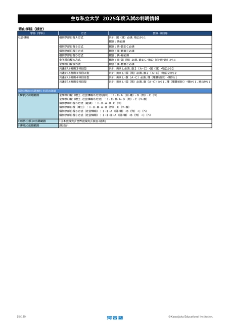 青山学院(続き)学部(学科)社会情報主な私立大学2025年度入試の判明情報方式個別学部日程A方式個別学部日程B方式個別学部日程C方式個別学部日程D方式全学部日程A方式全学部日程B方式共通テスト利用3科目型共通テスト利用4科目A型共通テスト利用4科目B型共通テスト利用5科目型教科・科目等共テ:国(現)必須、地公から1個別:英必須個別:英・数ⅡC必須個別:英・数ⅢC必須個別:英・総必須個別:英・国(現)必須、数ⅡC・地公(日・世・政)から1個別:英・数ⅢC必須共テ:英RL必須、数2(A・C)・国(現)・地公から2共テ:英RL・国(現)必須、数2(A・C)・地公2から2共テ:英RL・数(A・C)必須、理(理基を除く)・情から1共テ:英RL・国(現)必須、数(A・C)から1、理(理基を除く)・情から1、地公から1個別試験の出題教科・科目の詳細「数学」の出題範囲全学部日程(理工、社会情報B方式を除く):Ⅰ・Ⅱ・A(図・場)・B(列)・C(ベ)全学部日程(理工、社会情報B方式):Ⅰ・Ⅱ・Ⅲ・A・B(列)・C(ベ・複)個別学部日程B方式(経済):Ⅰ・Ⅱ・A・B・C(ベ)個別学部日程(理工):Ⅰ・Ⅱ・Ⅲ・A・B(列)・C(ベ・複)個別学部日程B方式(社会情報):Ⅰ・Ⅱ・A(図・場)・B(列)・C(ベ)個別学部日程C方式(社会情報):Ⅰ・Ⅱ・Ⅲ・A(図・場)・B(列)・C(ベ)「地歴・公民」の出題範囲「情報」の出題範囲「日本史探究」「世界史探究」「政治・経済」課さない15/129©KawaijukuEducationalInstitution.