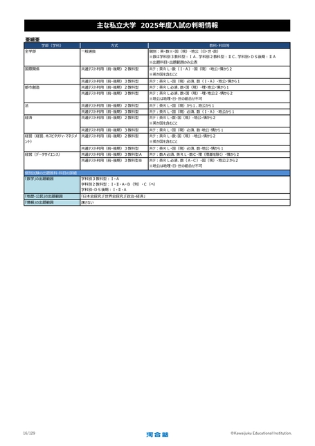 主な私立大学2025年度入試の判明情報学部(学科)方式一般選抜教科・科目等個別:英・数※・国(現)・地公(日・世・政)※数は学科別3教科型:ⅠA、学科別2教科型:ⅡC、学科別・DS後期:ⅡA※出題科目・出題範囲のみ公表共通テスト利用(前・後期)2教科型共通テスト利用(前・後期)3教科型共通テスト利用(前・後期)2教科型共通テスト利用(前・後期)3教科型共通テスト利用(前・後期)2教科型共通テスト利用(前・後期)3教科型共通テスト利用(前・後期)2教科型共通テスト利用(前・後期)3教科型共通テスト利用(前・後期)2教科型共通テスト利用(前・後期)3教科型共通テスト利用(前・後期)3教科型A共通テスト利用(前・後期)3教科型B共テ:英RL・数(Ⅰ・A)・国(現)・地公・情から2※英か国を含むこと共テ:英RL・国(現)必須、数(Ⅰ・A)・地公・情から1共テ:英RL必須、数・国(現)・理・地公・情から1共テ:英RL必須、数・国(現)・理・地公2・情から2※地公は地理・日・世の組合せ不可共テ:英RL・国(現)から1、地公から1共テ:英RL・国(現)必須、数(Ⅰ・A)・地公から1共テ:英RL・数・国(現)・地公・情から2※英か国を含むこと共テ:英RL・国(現)必須、数・地公・情から1共テ:英RL・数・国(現)・地公・情から2※英か国を含むこと共テ:英RL・国(現)必須、数・地公・情から1共テ:数A必須、英RL・数C・理(理基を除く)・情から2共テ:英RL必須、数(A・C)・国(現)・地公2から2※地公は地理・日・世の組合せ不可学科別3教科型:Ⅰ・A学科別2教科型:Ⅰ・Ⅱ・A・B(列)・C(ベ)学科別・DS後期:Ⅰ・Ⅱ・A「日本史探究」「世界史探究」「政治・経済」課さない亜細亜全学部国際関係都市創造法経済経営(経営、ホスピタリティ・マネジメント)経営(データサイエンス)個別試験の出題教科・科目の詳細「数学」の出題範囲「地歴・公民」の出題範囲「情報」の出題範囲16/129©KawaijukuEducationalInstitution.