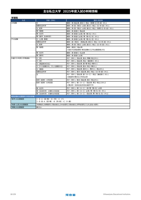 学習院コア試験プラス試験共通テスト利用入学者選抜主な私立大学2025年度入試の判明情報方式学部(学科)教科・科目等文国際社会科学法、経済理(物理)理(化学)理(数学、生命科学)文(心理、教育)国際社会科学法、経済理(物理)理(化学)理(数学)文(哲)文(史)文(英語英米文化)文(ドイツ語圏文化、フランス語圏文化)文(教育)国際社会科学法経済(経済)4科目型経済(経済)6科目型理(化学)理(生命科学)3教科4科目型理(生命科学)4教科6科目型個別:英・国必須、数ⅡC・地公(地理・日・世・政)から1個別:英・国(現古)必須、数ⅡC・地公(日・世・政)から1個別:英・国(現古)必須、数ⅡC・地公(地理・日・世・政)から1個別:英・数ⅢC・物必須個別:英・数ⅢC必須、理(物・化)から1個別:英・数ⅢC必須、理(物・化・生)から1個別:英・数ⅢC必須、理(物・化・生)から1個別:国(現古)・英資必須、数ⅡC・地公(日・世・政)から1個別:英・国(現古)必須、数ⅡC・地公(日・世・政)から1個別:数ⅢC・物必須※指定する英語資格・検定試験のスコアを出願資格とする個別:英・数ⅢC・化必須個別:英・数ⅢC必須共テ:英RL・国必須、数A・理基・地公から1共テ:英RL・国必須、地公(倫を除く)から1共テ:英RL・国必須、数・理・地公・情から1共テ:英RL・国必須、数A・地公・情から1共テ:英RL・国必須、数から1、理から1、地公から1共テ:英RL・数A・国必須、数C・地公(日・世・政)から1共テ:英RL・国必須、数(A・C)・地公(倫を除く)から1※数選択の場合は2科目必須共テ:英RL・数A・国必須、数C・地公から1共テ:英RL・数(A・C)・国必須、理2・地公2から2※理は同一名称を含む科目の選択不可共テ:英RL・数(A・C)・国・理(物・化)必須共テ:英RL・数(A・C)必須、理(物・化・生)から1共テ:英RL・数(A・C)・国必須、理(物・化・生)から2個別試験の出題教科・科目の詳細「数学」の出題範囲「地歴・公民」の出題範囲「情報」の出題範囲Ⅰ・Ⅱ・A(図・場)・B(列)・C(ベ)Ⅰ・Ⅱ・Ⅲ・A(図・場)・B(列・統)・C(ベ・複)「地理総合,地理探究」「歴史総合,日本史探究」「歴史総合,世界史探究」「公共,政治・経済」課さない18/129©KawaijukuEducationalInstitution.