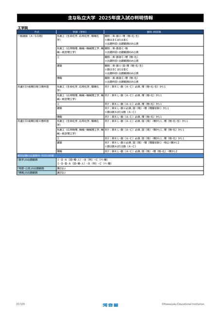 工学院方式一般選抜(A・S日程)主な私立大学2025年度入試の判明情報学部(学科)先進工(生命化学、応用化学、環境化学)個別:英・数※・理(物・化・生)※数はⅡCまたはⅢC※出題科目・出題範囲のみ公表先進工(応用物理、機械ー機械理工学、機械-航空理工学)個別:英・数ⅢC・物※出題科目・出題範囲のみ公表教科・科目等工建築情報個別:英・数ⅢC・理(物・化)※出題科目・出題範囲のみ公表個別:英・数※・国・理(物・化・生)※数はⅡCまたはⅢC※出題科目・出題範囲のみ公表個別:英・数ⅢC・理(物・化)※出題科目・出題範囲のみ公表共通テスト前期日程3教科型先進工(生命化学、応用化学、環境化学)先進工(応用物理、機械ー機械理工学、機械-航空理工学)共テ:英RL・数(A・C)必須、理(物・化・生)から1共テ:英RL・数(A・C)必須、理(物・化)から1共通テスト前期日程4教科型工建築情報先進工(生命化学、応用化学、環境化学)先進工(応用物理、機械ー機械理工学、機械-航空理工学)工建築情報共テ:英RL・数(A・C)必須、理(物・化)から1共テ:英RL・数※必須、国(現)・理(理基を除く)から1※数は数Aまたは数(A・C)共テ:英RL・数(A・C)必須、理(物・化)から1共テ:英RL・数(A・C)必須、国(現)・情から1、理(物・化・生)から1共テ:英RL・数(A・C)必須、国(現)・情から1、理(物・化)から1共テ:英RL・数(A・C)必須、国(現)・情から1、理(物・化)から1共テ:英RL・数※必須、国(現)・理(理基を除く)・地公・情から2※数は数Aまたは数(A・C)共テ:英RL・数(A・C)必須、国(現)・理(物・化)・情から2個別試験の出題教科・科目の詳細「数学」の出題範囲Ⅰ・Ⅱ・A(図・場・人)・B(列)・C(ベ・複)Ⅰ・Ⅱ・Ⅲ・A(図・場・人)・B(列)・C(ベ・複)「地歴・公民」の出題範囲「情報」の出題範囲課さない課さない22/129©KawaijukuEducationalInstitution.