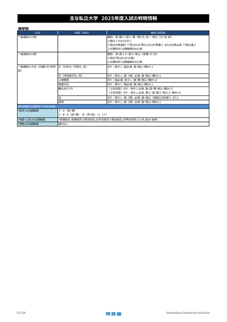 國學院方式一般選抜A日程一般選抜B日程主な私立大学2025年度入試の判明情報学部(学科)教科・科目等個別:英・数※・国※・理(物・化・生)・地公(日・世・政)※数はⅠAまたはⅡC※国は古典選択(「現」または「現古」または「現漢」)または古典必須(「現古漢」)※出題科目・出題範囲のみ公表個別:英・数ⅠA・国※・地公(地理・日・世)※国は「現」または「古漢」※出題科目・出題範囲のみ公表一般選抜V方式(共通テスト利用型)文(日本文、中国文、史)共テ:英RL・国必須、数・地公・情から1文(外国語文化、哲)人間開発神道文化観光まちづくり法経済共テ:英RL・国(現)必須、数・地公・情から1共テ:国必須、英RL・数・理・地公・情から2共テ:英RL・国必須、数・地公・情から1(3科目型)共テ:英RL必須、数・国・理・地公・情から2(5科目型)共テ:英RL必須、数2・国・理2・地公2・情から4共テ:英RL・国(現)必須、数・地公(地歴公共を除く)から1共テ:英RL・国(現)必須、数・地公・情から1個別試験の出題教科・科目の詳細「数学」の出題範囲「地歴・公民」の出題範囲「情報」の出題範囲Ⅰ・A(図・場)Ⅰ・Ⅱ・A(図・場)・B(列・統)・C(ベ)「地理総合,地理探究」「歴史総合,日本史探究」「歴史総合,世界史探究」「公共,政治・経済」課さない23/129©KawaijukuEducationalInstitution.