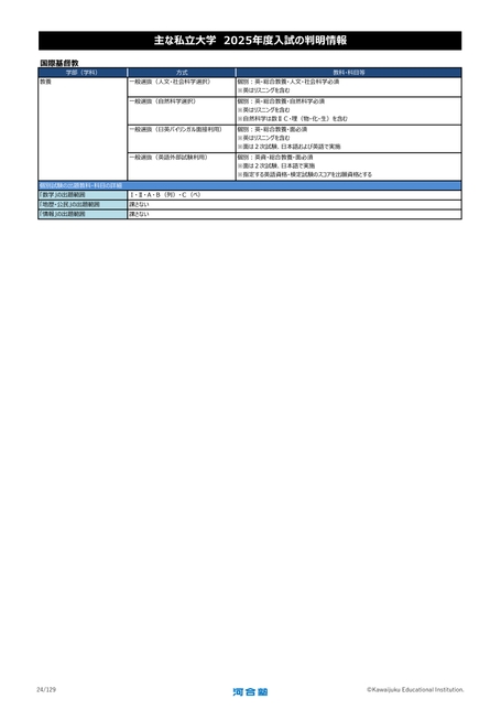 国際基督教学部(学科)教養主な私立大学2025年度入試の判明情報方式一般選抜(人文・社会科学選択)一般選抜(自然科学選択)一般選抜(日英バイリンガル面接利用)教科・科目等個別:英・総合教養・人文・社会科学必須※英はリスニングを含む個別:英・総合教養・自然科学必須※英はリスニングを含む※自然科学は数ⅡC・理(物・化・生)を含む個別:英・総合教養・面必須※英はリスニングを含む※面は2次試験、日本語および英語で実施一般選抜(英語外部試験利用)個別:英資・総合教養・面必須※面は2次試験、日本語で実施※指定する英語資格・検定試験のスコアを出願資格とする個別試験の出題教科・科目の詳細「数学」の出題範囲「地歴・公民」の出題範囲「情報」の出題範囲Ⅰ・Ⅱ・A・B(列)・C(ベ)課さない課さない24/129©KawaijukuEducationalInstitution.
