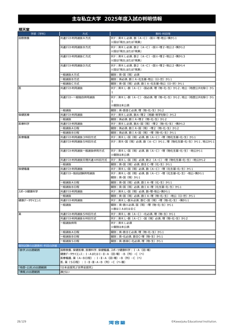 方式共通テスト利用選抜A方式共通テスト利用選抜B方式共通テスト利用選抜C方式共通テスト利用選抜D方式一般選抜A方式一般選抜B方式一般選抜C方式共通テスト利用選抜教科・科目等共テ:英RL必須、数(A・C)・国※・理・地公・情から1※国は「現古」または「現漢」共テ:英RL必須、数2(A・C)・国※・理2・地公2・情から2※国は「現古」または「現漢」共テ:英RL必須、数2(A・C)・国※・理2・地公2・情から3※国は「現古」または「現漢」共テ:英RL必須、数2(A・C)・国※・理2・地公2・情から4※国は「現古」または「現漢」個別:英・国(現)必須個別:英必須、数ⅠA・化生基・地公(日・世)から1個別:英・国(現)必須、数ⅠA・化生基・地公(日・世)から1共テ:英RL・数(A・C)・国必須、理(物・化・生)から2、地公(地歴公共を除く)から1共通テスト・一般独自併用選抜共テ:英RL・数(A・C)・国必須、理(物・化・生)から2、地公(地歴公共を除く)から個別は未公表1※一般選抜共通テスト利用選抜一般選抜共通テスト利用選抜一般選抜A日程一般選抜B日程共通テスト利用選抜3科目方式共通テスト利用選抜5科目方式個別:英・数ⅢC必須、理(物・化・生)から2共テ:英RL必須、数A・理2(地基・地学を除く)から2個別:英必須、数ⅠA・理2(物・化・生)から2共テ:英RL必須、数A・国(現)・理2(物・化・生)・情から2個別:英必須、数ⅠA・国(現)・理2(物・化・生)から2個別:英必須、数ⅠA・国(現)・理(物・化・生)から1共テ:英RL・国(現)必須、数(A・C)・理(物化生基・化・生)から1共テ:英R・国(現)必須、数(A・C)から1、理(物化生基・化・生)から1、地公から1共通テスト利用選抜一般選抜併用方式共通テスト利用選抜文理共通4科目方式一般選抜共通テスト利用選抜共通テスト・独自試験併用選抜共テ:英RL・国(現)必須、数(A・C)・理(物化生基・化・生)・地公から1※個別は未公表共テ:英RL・国(現)必須、数2(A・C)・理(物化生基・化・生)・地公から2個別:英・国(現)必須、数ⅡC・理(化・生)から1共テ:英RL・国(現)必須、数(A・C)・理(化生基・化・生)から1共テ:英RL・国(現)必須、数(A・C)・理(化生基・化・生)・地公・情から1個別:英・国(現)から1一般選抜A日程一般選抜B日程共通テスト利用選抜一般選抜共通テスト利用選抜一般選抜共通テスト利用選抜5科目方式共通テスト利用選抜6科目方式一般選抜併用個別:英・国(現)必須、数ⅠA・理(化・生)から1個別:英・国(現)必須、数ⅠA・理(化生基・化・生)から1共テ:英RL・国(現)必須、数・理・地公・情から1個別:英・国(現)必須、数ⅠA・理(物・化・生)・地公(日・世)から1共テ:英RL・数A必須、数C・国(現)・理(物・化・生)・情から1個別:英・数※必須、国(現)・理(物・化・生)から1※数はⅠAまたはⅡC共テ:英RL・数(A・C)・化必須、理(物・生)から1共テ:英RL・数(A・C)・国(現)必須、理(物・化・生)から2共テ:英RL必須※個別は未公表主な私立大学2025年度入試の判明情報順天堂国際教養学部(学科)医保健医療医療科学医療看護保健看護スポーツ健康科学健康データサイエンス薬個別試験の出題教科・科目の詳細「数学」の出題範囲一般選抜A日程一般選抜B日程一般選抜S日程個別:英・数ⅡC必須、理(物・化・生)から1個別:英・化必須、数ⅡC・理(物・生)から1個別:英・数ⅢC・化必須、理(物・生)から1国際教養、保健医療、医療科学、保健看護、スポーツ健康科学:Ⅰ・A(図・場)健康データサイエンス:Ⅰ・AまたはⅠ・Ⅱ・A(図・場)・B(列)・C(ベ)医療看護、薬(A・B日程):Ⅰ・Ⅱ・A(図・場)・B(列)・C(ベ)医、薬(S日程):Ⅰ・Ⅱ・Ⅲ・A・B(列)・C(ベ・複)「地歴・公民」の出題範囲「情報」の出題範囲「日本史探究」「世界史探究」課さない28/129©KawaijukuEducationalInstitution.