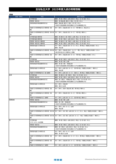 中央文法総合政策経済国際経営商主な私立大学2025年度入試の判明情報学部(学科)方式教科・科目等5学部共通学部別一般方式学部別英語外部試験利用方式共通テスト利用単独方式4教科型(前期)共通テスト利用単独方式3教科型(前・後期)個別:英・国(現古)必須、数ⅡC・地公(日・世・政)から1個別:英・国必須、数ⅡC・地公(日・世)から1個別:国必須、数ⅡC・地公(日・世)から1※指定する英語資格・検定試験のスコアを出願資格とする共テ:英RL・国必須、数(A・C)・理・情から1、地公から1共テ:英RL・国必須、数(A・C)・理・地公・情から15学部共通4教科型5学部共通3教科型学部別一般方式4教科型学部別一般方式3教科型学部別共通テスト併用方式個別:英・数ⅡC・国(現古)必須、地公(日・世・政)から1個別:英・国(現古)必須、数ⅡC・地公(日・世・政)から1個別:英・数ⅡC・国(現古)必須、地公(日・世・政)から1個別:英・国(現古)必須、数ⅡC・地公(日・世・政)から1共テ:英RL・国必須、数(A・C)から1、理・地公(地歴公共を除く)から1個別:英必須共通テスト利用単独方式5教科型(前・後期)共テ:英RL・国必須、数2(A・C)・理2・地公2(地歴公共を除く)から4※数・理・地公から3教科以上受験共通テスト利用単独方式3教科型(前期)5学部共通学部別一般方式学部別英語外部試験利用方式学部別共通テスト併用方式共通テスト利用単独方式(前・後期)5学部共通学部別一般方式学部別英語外部試験利用方式共テ:英RL・国必須、数(A・C)・理・地公(地歴公共を除く)から1個別:英・国(現古)必須、数ⅡC・地公(日・世・政)から1個別:英・国(現)必須個別:英・国(現)・英資必須※指定する英語資格・検定試験のスコアを出願資格とする共テ:英RL必須、数(A・C)・国・理・地公(地歴公共を除く)・情から2個別:英必須共テ:英RL必須、数(A・C)・国から1、理・地公(地歴公共を除く)・情から1個別:英・数ⅡC・国(現古)・地公(日・世・政)から3個別:英・国(現古)必須、数ⅡC・地公(日・世・政)から1個別:国(現古)・英資必須、数ⅡC・地公(日・世・政)から1※指定する英語資格・検定試験のスコアを出願資格とする学部別共通テスト併用方式共テ:英RL・国必須個別:数ⅡC必須共通テスト利用単独方式4教科型(前期)共通テスト利用単独方式3教科型(前期)共通テスト利用単独方式(後期)学部別一般方式学部別英語外部試験利用方式共テ:英RL・数A・国必須、数C・理・地公・情から1共テ:英RL・国必須、数(A・C)・理・地公・情から1共テ:英RL必須、数(A・C)・国・理・地公・情から2個別:英・国(現)必須個別:国(現)・英資必須※指定する英語資格・検定試験のスコアを出願資格とする学部別共通テスト併用方式共テ:英RL・数(A・C)必須個別:英必須共通テスト利用単独方式4教科型(前・後期)共通テスト利用単独方式3教科型(前・後期)5学部共通※フリーメジャーのみ実施学部別一般方式学部別英語外部試験利用方式学部別共通テスト併用方式共通テスト利用単独方式4教科型(前期)共通テスト利用単独方式3教科型(前期)共テ:英RL・国(現)必須、数(A・C)から1、地公(地歴公共を除く)・情から1共テ:英RL・国(現)必須、数(A・C)・地公(地歴公共を除く)・情から1個別:英・国(現古)必須、数ⅡC・地公(日・世・政)から1個別:英・国(現古)必須、数ⅡC・地公(日・世・政)から1個別:国(現古)必須、数ⅡC・地公(日・世・政)から1※指定する英語資格・検定試験のスコアを出願資格とする共テ:英RL・数(A・C)必須個別:英・数ⅡC必須共テ:英RL・国必須、数(A・C)から1、理・地公(地歴公共を除く)・情から1共テ:英RL・国必須、数(A・C)・理・地公(地歴公共を除く)・情から1共通テスト利用単独方式(後期)共テ:英RL必須、数(A・C)・国・理・地公(地歴公共を除く)・情から237/129©KawaijukuEducationalInstitution.