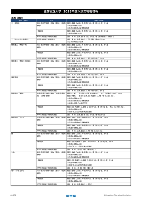 主な私立大学2025年度入試の判明情報方式文系・理系学部統一選抜(理系)(前期・後期)一般選抜大学入学共通テスト利用選抜大学入学共通テスト利用型教科・科目等個別:数ⅡC必須、英・英資から1、理(物・化・生)から1※英語の受験は必須※合否には高得点2教科を利用個別:数ⅢC必須、英・英資から1、理(物・化・生)から1※英語の受験は必須共テ:英RL必須、数・国(現)から1、理(地学を除く)・情から1共テ:英RL必須、数から1、国(現)・理・地公から1※2次の内容は未公表東海(続き)学部(学科)工(生物工)工(航空-航空操縦学)情報理工(情報科学)情報理工(情報科学を除く)大学入学共通テスト利用選抜文系・理系学部統一選抜(理系)(前期・後期)情報通信建築都市(建築)建築都市(土木工)農生物海洋(水産を除く)文系・理系学部統一選抜(理系)(前期・後期)一般選抜一般選抜大学入学共通テスト利用選抜文系・理系学部統一選抜(理系)(前期・後期)一般選抜大学入学共通テスト利用選抜文系・理系学部統一選抜(文系・理系併用)(前期・後期)一般選抜個別:数ⅡC必須、英・英資から1、理(物・化・生)から1※英語の受験は必須※合否には高得点2教科を利用個別:数ⅢC必須、英・英資から1、理(物・化・生)から1※英語の受験は必須共テ:英RL必須、数から2、理(地学を除く)から1個別:数ⅡC必須、英・英資から1、理(物・化・生)から1※英語の受験は必須※合否には高得点2教科を利用個別:数ⅡC必須、英・英資から1、理(物・化・生)から1※英語の受験は必須共テ:英RL必須、数から2、理(地学を除く)から1個別:数ⅡC必須、英・英資から1、理(物・化・生)から1※英語の受験は必須※合否には高得点2教科を利用個別:数ⅡC必須、英・英資から1、理(物・化・生)から1※英語の受験は必須共テ:英RL必須、数から2、理(地学を除く)から1個別(文系):国(現)必須、英・英資から1、地公(地理・日・世・政)から1個別(理系):数ⅡC必須、英・英資から1、理(物・化・生)から1※英語の受験は必須※合否には高得点2教科を利用※後期は地理・政の選択不可個別:英・英資から1、数ⅡC・国※から1、理(物・化・生)・地公(日・世)から1※英語の受験は必須※国は「現」または「現古漢」から選択大学入学共通テスト利用選抜文系・理系学部統一選抜(理系)(前期・後期)一般選抜大学入学共通テスト利用選抜文系・理系学部統一選抜(理系)(前期・後期)一般選抜共テ:英RL必須、数・国(現)から1、理・地公から1個別:数ⅡC必須、英・英資から1、理(物・化・生)から1※英語の受験は必須※合否には高得点2教科を利用個別:数ⅢC必須、英・英資から1、理(物・化・生)から1※英語の受験は必須共テ:英RL必須、数から2、理(物・化・生)から1個別:数ⅡC必須、英・英資から1、理(物・化・生)から1※英語の受験は必須※合否には高得点2教科を利用個別:英・英資から1、数ⅡC・国※から1、理(物・化・生)から1※英語の受験は必須※国は「現」または「現古漢」から選択大学入学共通テスト利用選抜文系・理系学部統一選抜(理系)(前期・後期)共テ:英RL・数・国(現)・理・情から3個別:数ⅡC必須、英・英資から1、理(物・化・生)から1※英語の受験は必須※合否には高得点2教科を利用一般選抜大学入学共通テスト利用選抜文系・理系学部統一選抜(理系)(前期・後期)一般選抜個別:英・英資から1、数ⅡC・国※から1、理(物・化・生)から1※英語の受験は必須※国は「現」または「現古漢」から選択共テ:英RL・数・国(現)・理から3個別:数ⅡC必須、英・英資から1、理(物・化・生)から1※英語の受験は必須※合否には高得点2教科を利用個別:数ⅡC必須、英・英資から1、理(物・化・生)から1※英語の受験は必須大学入学共通テスト利用選抜共テ:英RL必須、数から1、理から144/129©KawaijukuEducationalInstitution.