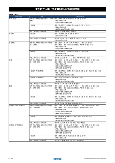 主な私立大学2025年度入試の判明情報東海(続き)学部(学科)海洋(水産)方式文系・理系学部統一選抜(理系)(前期・後期)医(医)医(看護)体育健康一般選抜大学入学共通テスト利用選抜一般選抜大学入学共通テスト利用選抜文系・理系学部統一選抜(文系・理系併用)(後期)一般選抜大学入学共通テスト利用選抜文系・理系学部統一選抜(文系・理系併用)(前期・後期)一般選抜(筆記試験型)一般選抜(実技試験型)大学入学共通テスト利用選抜文系・理系学部統一選抜(文系・理系併用)(前期・後期)一般選抜文理融合(経営、地域社会)大学入学共通テスト利用選抜文系・理系学部統一選抜(文系・理系併用)(前期・後期)一般選抜文理融合(人間情報工)大学入学共通テスト利用選抜文系・理系学部統一選抜(文系・理系併用)(前期・後期)教科・科目等個別:数ⅡC必須、英・英資から1、理(物・化・生)から1※英語の受験は必須※合否には高得点2教科を利用個別:英・英資から1、数ⅡC・国※から1、理(物・化・生)から1※英語の受験は必須※国は「現」または「現古漢」から選択共テ:英RL必須、数から1、理から1個別:英・数ⅡC必須、理(物・化・生)から1※2次の内容は未公表共テ:英RL・数(A・C)必須、理(物・化・生)から2※2次の内容は未公表個別(文系):国(現)必須、英・英資から1、地公(日・世)から1個別(理系):数ⅡC必須、英・英資から1、理(物・化・生)から1※英語の受験は必須※合否には高得点2教科を利用個別:英・英資から1、数ⅠA・国※から1、理(物・化)から1※英語の受験は必須※国は「現」または「現古漢」から選択共テ:英RL必須、数(Ⅰ・A)から1、理(地学を除く)から1個別(文系):国(現)必須、英・英資から1、地公(地理・日・世・政)から1個別(理系):数ⅡC必須、英・英資から1、理(物・化・生)から1※英語の受験は必須※合否には高得点2教科を利用※後期は地理・政の選択不可個別:英・英資から1、数ⅡC・国※から1、理(物・化・生)・地公(日・世)から1※英語の受験は必須※国は「現」または「現古漢」から選択個別:実必須、英・英資から1、数ⅠA・国※から1※英語の受験は必須※国は「現」または「現古漢」から選択共テ:英RL・国(現)必須、数・理・地公から1個別(文系):国(現)必須、英・英資から1、地公(地理・日・世・政)から1個別(理系):数ⅡC必須、英・英資から1、理(物・化・生)から1※英語の受験は必須※合否には高得点2教科を利用※後期は地理・政の選択不可個別:英・英資から1、数ⅡC・国※から1、理(物・化・生)・地公(日・世)から1※英語の受験は必須※国は「現」または「現古漢」から選択共テ:英RL・国(現)必須、数・理・地公・情から1個別(文系):国(現)必須、英・英資から1、地公(地理・日・世・政)から1個別(理系):数ⅡC必須、英・英資から1、理(物・化・生)から1※英語の受験は必須※合否には高得点2教科を利用※後期は地理・政の選択不可個別:国※必須、英・英資から1、数ⅡA・地公(日・世・政)から1※英語の受験は必須※国は「現」または「現古漢」から選択共テ:英RL必須、数・国(現)から1、地公・情から1個別(文系):国(現)必須、英・英資から1、地公(地理・日・世・政)から1個別(理系):数ⅡC必須、英・英資から1、理(物・化・生)から1※英語の受験は必須※合否には高得点2教科を利用※後期は地理・政の選択不可一般選抜個別:数ⅡC必須、英・英資から1、理(物・化・生)から1※英語の受験は必須大学入学共通テスト利用選抜共テ:英RL必須、数・国(現)から1、理・情から145/129©KawaijukuEducationalInstitution.