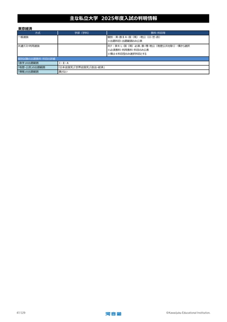 東京経済一般選抜方式共通テスト利用選抜主な私立大学2025年度入試の判明情報学部(学科)教科・科目等個別:英・数ⅡA・国(現)・地公(日・世・政)※出題科目・出題範囲のみ公表共テ:英RL・国(現)必須、数・理・地公(地歴公共を除く)・情から選択※必須教科・利用教科・科目のみ公表※情は4科目型のみ選択科目とする個別試験の出題教科・科目の詳細「数学」の出題範囲「地歴・公民」の出題範囲「情報」の出題範囲Ⅰ・Ⅱ・A「日本史探究」「世界史探究」「政治・経済」課さない47/129©KawaijukuEducationalInstitution.