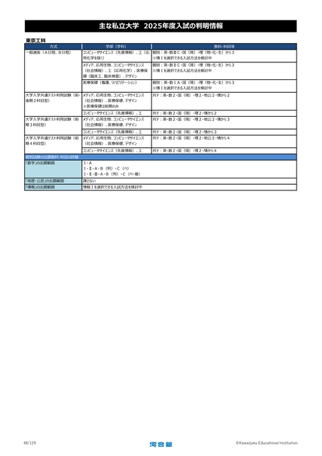 東京工科方式一般選抜(A日程、B日程)大学入学共通テスト利用試験(前・後期2科目型)大学入学共通テスト利用試験(前期3科目型)大学入学共通テスト利用試験(前期4科目型)個別試験の出題教科・科目の詳細「数学」の出題範囲「地歴・公民」の出題範囲「情報」の出題範囲主な私立大学2025年度入試の判明情報学部(学科)コンピュータサイエンス(先進情報)、工(応用化学を除く)メディア、応用生物、コンピュータサイエンス(社会情報)、工(応用化学)、医療保健(臨床工、臨床検査)、デザイン医療保健(看護、リハビリテーション)メディア、応用生物、コンピュータサイエンス(社会情報)、医療保健、デザイン※医療保健は前期のみコンピュータサイエンス(先進情報)、工メディア、応用生物、コンピュータサイエンス(社会情報)、医療保健、デザインコンピュータサイエンス(先進情報)、工メディア、応用生物、コンピュータサイエンス(社会情報)、医療保健、デザイン教科・科目等個別:英・数ⅢC・国(現)・理(物・化・生)から3※情Ⅰを選択できる入試方法を検討中個別:英・数ⅡC・国(現)・理(物・化・生)から3※情Ⅰを選択できる入試方法を検討中個別:英・数ⅠA・国(現)・理(物・化・生)から3※情Ⅰを選択できる入試方法を検討中共テ:英・数2・国(現)・理2・地公2・情から2共テ:英・数2・国(現)・理2・情から2共テ:英・数2・国(現)・理2・地公2・情から3共テ:英・数2・国(現)・理2・情から3共テ:英・数2・国(現)・理2・地公2・情から4コンピュータサイエンス(先進情報)、工共テ:英・数2・国(現)・理2・情から4Ⅰ・AⅠ・Ⅱ・A・B(列)・C(ベ)Ⅰ・Ⅱ・Ⅲ・A・B(列)・C(ベ・複)課さない情報Ⅰを選択できる入試方法を検討中48/129©KawaijukuEducationalInstitution.