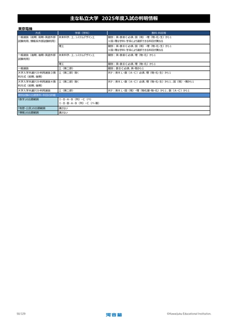 主な私立大学2025年度入試の判明情報東京電機方式一般選抜(前期、前期・英語外部試験利用、情報系外部試験利用)学部(学科)未来科学、工、システムデザイン工理工教科・科目等個別:英・数ⅢC必須、国(現)・理(物・化・生)から1※国・理は学科・学系により選択できる科目が異なる個別:英・数ⅡC必須、国(現)・理(物・化・生)から1※国・理は学科・学系により選択できる科目が異なる一般選抜(後期、後期・英語外部試験利用)一般選抜大学入学共通テスト利用選抜3教科方式(前期、後期)大学入学共通テスト利用選抜4教科方式(前期、後期)未来科学、工、システムデザイン工個別:英・数ⅢC必須、理(物・化)から1理工工(第二部)工(第二部)除く個別:英・数ⅡC必須、理(物・化)から1個別:数ⅡC必須、英・物から1共テ:英RL・数(A・C)必須、理(物・化・生)から1工(第二部)除く共テ:英RL・数(A・C)必須、理(物・化・生)から1、国(現)・情から1大学入学共通テスト利用選抜工(第二部)共テ:英RL・国(現)・理(物化基・物・化)から1、数(A・C)から1個別試験の出題教科・科目の詳細「数学」の出題範囲Ⅰ・Ⅱ・A・B(列)・C(ベ)Ⅰ・Ⅱ・Ⅲ・A・B(列)・C(ベ・複)「地歴・公民」の出題範囲「情報」の出題範囲課さない課さない50/129©KawaijukuEducationalInstitution.