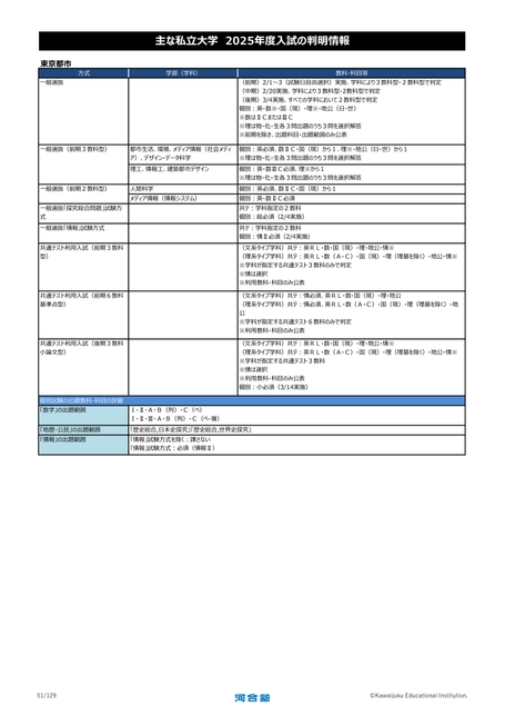 東京都市一般選抜方式主な私立大学2025年度入試の判明情報学部(学科)教科・科目等(前期)2/1~3(試験日自由選択)実施、学科により3教科型・2教科型で判定(中期)2/20実施、学科により3教科型・2教科型で判定(後期)3/4実施、すべての学科において2教科型で判定個別:英・数※・国(現)・理※・地公(日・世)※数はⅡCまたはⅢC※理は物・化・生各3問出題のうち3問を選択解答※前期を除き、出題科目・出題範囲のみ公表一般選抜(前期3教科型)都市生活、環境、メディア情報(社会メディア)、デザイン・データ科学個別:英必須、数ⅡC・国(現)から1、理※・地公(日・世)から1※理は物・化・生各3問出題のうち3問を選択解答理工、情報工、建築都市デザイン個別:英・数ⅢC必須、理※から1※理は物・化・生各3問出題のうち3問を選択解答(文系タイプ学科)共テ:英RL・数・国(現)・理・地公・情※(理系タイプ学科)共テ:英RL・数(A・C)・国(現)・理(理基を除く)・地公・情※※学科が指定する共通テスト3教科のみで判定※情は選択※利用教科・科目のみ公表(文系タイプ学科)共テ:情必須、英RL・数・国(現)・理・地公(理系タイプ学科)共テ:情必須、英RL・数(A・C)・国(現)・理(理基を除く)・地学科が指定する共通テスト6教科のみで判定公※※利用教科・科目のみ公表(文系タイプ学科)共テ:英RL・数・国(現)・理・地公・情※(理系タイプ学科)共テ:英RL・数(A・C)・国(現)・理(理基を除く)・地公・情※※学科が指定する共通テスト3教科※情は選択※利用教科・科目のみ公表個別:小必須(3/14実施)個別:英必須、数ⅡC・国(現)から1個別:英・数ⅡC必須共テ:学科指定の2教科個別:総必須(2/4実施)共テ:学科指定の2教科個別:情Ⅱ必須(2/4実施)一般選抜(前期2教科型)人間科学メディア情報(情報システム)一般選抜「探究総合問題」試験方式一般選抜「情報」試験方式共通テスト利用入試(前期3教科型)共通テスト利用入試(前期6教科基準点型)共通テスト利用入試(後期3教科小論文型)個別試験の出題教科・科目の詳細「数学」の出題範囲「地歴・公民」の出題範囲「情報」の出題範囲Ⅰ・Ⅱ・A・B(列)・C(ベ)Ⅰ・Ⅱ・Ⅲ・A・B(列)・C(ベ・複)「歴史総合,日本史探究」「歴史総合,世界史探究」「情報」試験方式を除く:課さない「情報」試験方式:必須(情報Ⅱ)51/129©KawaijukuEducationalInstitution.