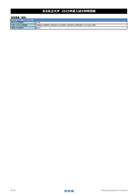 主な私立大学2025年度入試の判明情報東京農業(続き)個別試験の出題教科・科目の詳細「数学」の出題範囲「地歴・公民」の出題範囲「情報」の出題範囲未公表「地理総合,地理探究」「歴史総合,日本史探究」「歴史総合,世界史探究」「公共,政治・経済」課さない53/129©KawaijukuEducationalInstitution.
