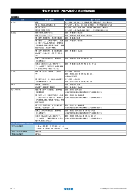 東京理科A方式方式B方式C方式S方式グローバル方式主な私立大学2025年度入試の判明情報学部(学科)経営理、工、先進工、創域理工、薬理二部(数学)理二部(物理、化学)経営(経営、国際デザイン)経営(ビジネスエコノミクス)理(数学、応用数学)、理二部(数学)理(物理)、工(工業化学を除く)、先進工(電子システム工、物理工)、創域理工(先端物理、建築、電気電子情報工、機械航空宇宙工)、理二部(物理)理(化学、応用化学)、工(工業化学)、創域理工(先端化学)、薬、理二部(化学)先進工(マテリアル創成工)、創域理工(社会基盤工)先進工(生命システム工、機能デザイン工)、創域理工(数理科学、情報計算科学、生命生物科学、経営システム工)経営、理(数学)、創域理工(数理科学)教科・科目等共テ:英RL・数(A・C)・国必須、理(理基を除く)・地公・情から1共テ:英RL・数(A・C)必須、国・情から1、理(理基を除く)から1共テ:数(A・C)必須、英RL・国・理(理基を除く)・情から1共テ:英RL・数C必須、数A・情から1、理(理基を除く)から1個別:英・数ⅡC・国必須個別:英・数ⅡC必須、数ⅢC・国から1個別:英・数ⅢC必須個別:英・数ⅢC・物必須個別:英・数ⅢC・化必須個別:英・数ⅢC必須、理(物・化)から1個別:英・数ⅢC必須、理(物・化・生)から1共テ:英RL・国必須個別:数ⅢC必須、理(物・化・生)から1※数のみで受験可理(数学を除く)、工、先進工、創域理工(数理科学を除く)、薬共テ:英RL・国必須個別:数ⅢC必須、理(物・化・生)から1創域理工(数理科学)創域理工(電気電子情報工)経営、理(数学、応用数学)、創域理工(数理科学)個別:英・数ⅢC必須個別:英・数ⅢC・物必須個別:数ⅢC・英資必須※指定する英語資格・検定試験のスコアを出願資格とする理(物理)、工(工業化学を除く)、先進工(電子システム工、物理工)、創域理工(先端物理、建築、電気電子情報工、機械航空宇宙工)個別:数ⅢC・物・英資必須※指定する英語資格・検定試験のスコアを出願資格とする理(化学、応用化学)、工(工業化学)、創域理工(先端化学)、薬個別:数ⅢC・化・英資必須※指定する英語資格・検定試験のスコアを出願資格とする先進工(マテリアル創成工)、創域理工(社会基盤工)個別:数ⅢC・英資必須、理(物・化)から1※指定する英語資格・検定試験のスコアを出願資格とする先進工(生命システム工、機能デザイン工)、創域理工(情報計算科学、生命生物科学、経営システム工)個別:数ⅢC・英資必須、理(物・化・生)から1※指定する英語資格・検定試験のスコアを出願資格とする個別試験の出題教科・科目の詳細「数学」の出題範囲Ⅰ・Ⅱ・A(図・場)・B(列・統)・C(ベ)Ⅰ・Ⅱ・Ⅲ・A(図・場)・B(列・統)・C(ベ・複)「地歴・公民」の出題範囲「情報」の出題範囲課さない課さない54/129©KawaijukuEducationalInstitution.
