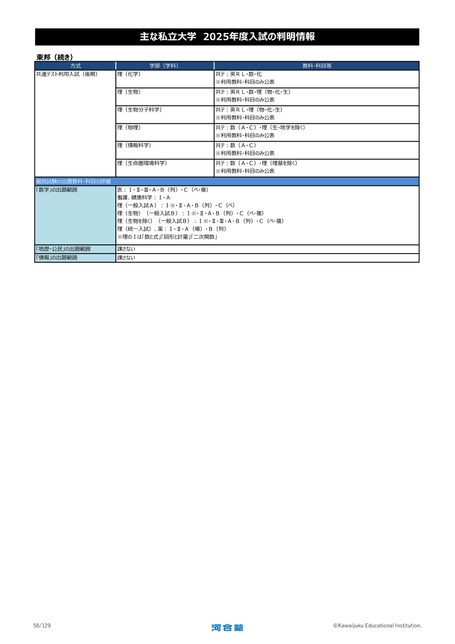 主な私立大学2025年度入試の判明情報東邦(続き)方式共通テスト利用入試(後期)理(化学)学部(学科)教科・科目等理(生物)理(生物分子科学)理(物理)理(情報科学)理(生命圏環境科学)共テ:英RL・数・化※利用教科・科目のみ公表共テ:英RL・数・理(物・化・生)※利用教科・科目のみ公表共テ:英RL・理(物・化・生)※利用教科・科目のみ公表共テ:数(A・C)・理(生・地学を除く)※利用教科・科目のみ公表共テ:数(A・C)※利用教科・科目のみ公表共テ:数(A・C)・理(理基を除く)※利用教科・科目のみ公表個別試験の出題教科・科目の詳細「数学」の出題範囲医:Ⅰ・Ⅱ・Ⅲ・A・B(列)・C(ベ・複)看護、健康科学:Ⅰ・A理(一般入試A):Ⅰ※・Ⅱ・A・B(列)・C(ベ)理(生物)(一般入試B):Ⅰ※・Ⅱ・A・B(列)・C(ベ・複)理(生物を除く)(一般入試B):Ⅰ※・Ⅱ・Ⅲ・A・B(列)・C(ベ・複)理(統一入試)、薬:Ⅰ・Ⅱ・A(場)・B(列)※理のⅠは「数と式」「図形と計量」「二次関数」「地歴・公民」の出題範囲「情報」の出題範囲課さない課さない56/129©KawaijukuEducationalInstitution.