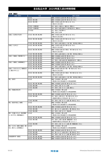 主な私立大学2025年度入試の判明情報日本(続き)学部(学科)工方式A方式N方式(第1期)N方式(第2期)C方式(3教科型)C方式(4教科型)CA方式生産工(応用分子化学)A方式(第1期、第2期)生産工(土木工)生産工(機械工、電気電子工)生産工(建築工、数理情報工)生産工(マネジメント工、環境安全工、創生デザイン工)理工(数学)理工(物質応用化学)N方式(第1期、第2期)C方式(第1期、第2期)A方式(第1期、第2期)N方式(第1期、第2期)C方式(第1期、第2期)A方式(第1期、第2期)N方式(第1期、第2期)C方式(第1期、第2期)A方式(第1期、第2期)N方式(第1期、第2期)C方式(第1期、第2期)A方式(第1期、第2期)N方式(第1期、第2期)C方式(第1期、第2期)A方式N方式(第1期、第2期)C方式(第1期)C方式(第2期)A方式N方式(第1期、第2期)C方式(第1期)理工(航空宇宙工、物理)C方式(第2期)A方式理工(交通システム工、海洋建築工、まちづくり工、精密機械工)理工(土木工、建築、機械工、電気工、電子工、応用情報工)生物資源科学(獣医)N方式(第1期、第2期)C方式(第1期)C方式(第2期)A方式N方式(第1期、第2期)C方式(第1期)C方式(第2期)A方式N方式(第1期、第2期)C方式(第1期)C方式(第2期)A方式(第1期、第2期)N方式(第1期、第2期)教科・科目等個別:英・数ⅡC必須、理(物・化・生)から1個別:英・数ⅢC必須、理(物・化・生)から1個別:英・数※必須、理(物・化・生)から1※数はⅡCまたはⅢC共テ:英RL・国から1、数から2、理から1共テ:英RL必須、数から2、国・地公から1、理から1共テ:英RL・国・理から1個別:数ⅡC必須個別:英・数※必須、理(物・化・生)から1※数はⅡCまたはⅢC個別:英・数※必須、理(物・化・生)から1※数はⅡCまたはⅢC共テ:英RL必須、数から1、国(現)・理・地公・情から1個別:英・数※必須、理(物・化・生)から1※数はⅡCまたはⅢC個別:英・数※必須、国(現古)・理(物・化・生)から1※数はⅡCまたはⅢC共テ:英RL必須、数から1、国(現)・理・地公・情から1個別:英・数ⅢC必須、理(物・化)から1個別:英・数ⅢC必須、理(物・化)から1共テ:英RL・数C必須、理(物化基・物・化)・情から1個別:英・数ⅢC必須、理(物・化)から1個別:英・数ⅢC必須、理(物・化)から1共テ:英RL必須、数から1、国(現)・理・地公・情から1個別:英・数※必須、国(現)・理(物・化・生)から1※数はⅡCまたはⅢC個別:英・数※必須、国(現古)・理(物・化・生)から1※数はⅡCまたはⅢC共テ:英RL必須、数から1、国(現)・理・地公・情から1個別:英・数ⅢC・理※必須※理は物・化各3問出題のうち3問を選択解答個別:英・数ⅢC必須、理(物・化・生)から1共テ:英RL・数(A・C)必須共テ:英RL・数(A・C)必須、理から1個別:英・数ⅢC・理※必須※理は物・化各3問出題のうち3問を選択解答個別:英・数ⅢC必須、理(物・化・生)から1共テ:英RL・数※から1、理(物・化・生)から1※数選択の場合は2科目必須(数(A・C))共テ:英RL・数(A・C)必須、理(物・化)から1個別:英・数ⅢC・理※必須※理は物・化各3問出題のうち3問を選択解答個別:英・数ⅢC必須、理(物・化・生)から1共テ:数(A・C)必須、英RL・理(物・化)から1共テ:英RL・数(A・C)・物必須個別:英・数ⅢC・理※必須※理は物・化各3問出題のうち3問を選択解答個別:英・数ⅢC必須、理(物・化・生)から1共テ:英RL・数※・国・理(理基を除く)から2※数選択の場合は2科目必須(数(A・C))共テ:英RL・数(A・C)必須、理(理基を除く)から1個別:英・数ⅢC・理※必須※理は物・化各3問出題のうち3問を選択解答個別:英・数ⅢC必須、理(物・化・生)から1共テ:数(A・C)必須、英RL・理(物・化)から1共テ:英RL・数(A・C)必須、理(物・化)から1個別:英・数ⅡC必須、理(物・化・生)から1個別:英・数ⅡC必須、理(物・化・生)から159/129©KawaijukuEducationalInstitution.