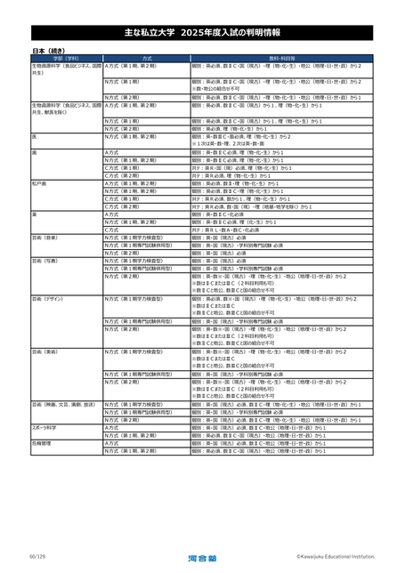 主な私立大学2025年度入試の判明情報日本(続き)学部(学科)生物資源科学(食品ビジネス、国際共生)生物資源科学(食品ビジネス、国際共生、獣医を除く)方式教科・科目等A方式(第1期、第2期)個別:英必須、数ⅡC・国(現古)・理(物・化・生)・地公(地理・日・世・政)から2N方式(第1期)個別:英必須、数ⅡC・国(現古)・理(物・化・生)・地公(地理・日・世・政)から2※数・地公の組合せ不可N方式(第2期)A方式(第1期、第2期)個別:英必須、数ⅡC・国(現古)・理(物・化・生)・地公(地理・日・世・政)から1個別:英必須、数ⅡC・国(現古)から1、理(物・化・生)から1医歯松戸歯薬芸術(音楽)芸術(写真)N方式(第1期)N方式(第2期)N方式(第1期、第2期)A方式N方式(第1期、第2期)C方式(第1期)C方式(第2期)A方式(第1期、第2期)N方式(第1期、第2期)C方式(第1期)C方式(第2期)A方式N方式(第1期、第2期)C方式N方式(第1期学力検査型)N方式(第1期専門試験併用型)N方式(第2期)N方式(第1期学力検査型)N方式(第1期専門試験併用型)N方式(第2期)芸術(デザイン)N方式(第1期学力検査型)N方式(第1期専門試験併用型)N方式(第2期)芸術(美術)N方式(第1期学力検査型)N方式(第1期専門試験併用型)N方式(第2期)個別:英必須、数ⅡC・国(現古)から1、理(物・化・生)から1個別:英必須、理(物・化・生)から1個別:英・数ⅢC・面必須、理(物・化・生)から2※1次は英・数・理、2次は英・数・面個別:英・数ⅡC必須、理(物・化・生)から1個別:英・数ⅡC必須、理(物・化・生)から1共テ:英R・国(現)必須、理(物・化・生)から1共テ:英R必須、理(物・化・生)から1個別:英必須、数Ⅱ・理(物・化・生)から1個別:英必須、数ⅡC・理(物・化・生)から1共テ:英R必須、数から1、理(物・化・生)から1共テ:英R必須、数・国(現)・理(地基・地学を除く)から1個別:英・数ⅡC・化必須個別:英・数ⅡC必須、理(化・生)から1共テ:英RL・数A・数C・化必須個別:英・国(現古)必須個別:英・国(現古)・学科別専門試験必須個別:英・国(現古)必須個別:英・国(現古)必須個別:英・国(現古)・学科別専門試験必須個別:英・数※・国(現古)・理(物・化・生)・地公(地理・日・世・政)から2※数はⅡCまたはⅢC(2科目利用も可)※数ⅡCと地公、数ⅢCと国の組合せ不可個別:英必須、数※・国(現古)・理(物・化・生)・地公(地理・日・世・政)から2※数はⅡCまたはⅢC※数ⅡCと地公、数ⅢCと国の組合せ不可個別:英・国(現古)・学科別専門試験必須個別:英・数※・国(現古)・理(物・化・生)・地公(地理・日・世・政)から2※数はⅡCまたはⅢC(2科目利用も可)※数ⅡCと地公、数ⅢCと国の組合せ不可個別:英・数※・国(現古)・理(物・化・生)・地公(地理・日・世・政)から2※数はⅡCまたはⅢC※数ⅡCと地公、数ⅢCと国の組合せ不可個別:英・国(現古)・学科別専門試験必須個別:英・数※・国(現古)・理(物・化・生)・地公(地理・日・世・政)から2※数はⅡCまたはⅢC(2科目利用も可)※数ⅡCと地公、数ⅢCと国の組合せ不可芸術(映画、文芸、演劇、放送)スポーツ科学危機管理N方式(第1期学力検査型)N方式(第1期専門試験併用型)N方式(第2期)A方式N方式(第1期、第2期)A方式N方式(第1期、第2期)個別:英・国(現古)必須、数ⅡC・理(物・化・生)・地公(地理・日・世・政)から1個別:英・国(現古)・学科別専門試験必須個別:英・国(現古)必須、数ⅡC・理(物・化・生)・地公(地理・日・世・政)から1個別:英・国(現古)必須、数ⅡC・地公(地理・日・世・政)から1個別:英必須、数ⅡC・国(現古)・地公(地理・日・世・政)から1個別:英・国(現古)必須、数ⅡC・地公(地理・日・世・政)から1個別:英必須、数ⅡC・国(現古)・地公(地理・日・世・政)から160/129©KawaijukuEducationalInstitution.