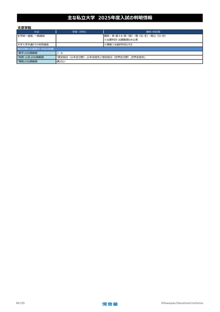 主な私立大学2025年度入試の判明情報文京学院方式全学統一選抜、一般選抜大学入学共通テスト利用選抜個別試験の出題教科・科目の詳細「数学」の出題範囲「地歴・公民」の出題範囲「情報」の出題範囲学部(学科)教科・科目等個別:英・数ⅠA・国(現)・理(化・生)・地公(日・世)※出題科目・出題範囲のみ公表※情報Ⅰを選択科目とするⅠ・A「歴史総合(日本史分野),日本史探究」「歴史総合(世界史分野),世界史探究」課さない64/129©KawaijukuEducationalInstitution.