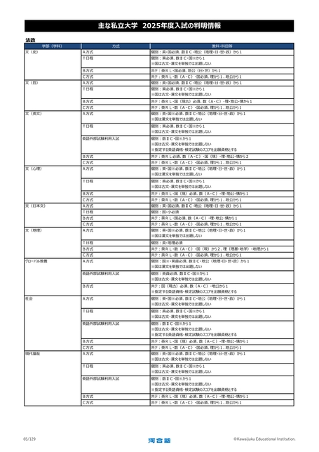 主な私立大学2025年度入試の判明情報学部(学科)方式A方式T日程B方式C方式A方式T日程B方式C方式A方式T日程英語外部試験利用入試B方式C方式A方式T日程B方式C方式A方式T日程B方式C方式A方式T日程B方式C方式A方式教科・科目等個別:英・国必須、数ⅡC・地公(地理・日・世・政)から1個別:英必須、数ⅡC・国※から1※国は古文・漢文を単独では出題しない共テ:英RL・国必須、地公(日・世)から1共テ:英RL・数(A・C)・国必須、理から1、地公から1個別:英・国必須、数ⅡC・地公(地理・日・世・政)から1個別:英必須、数ⅡC・国※から1※国は古文・漢文を単独では出題しない共テ:英RL・国(現古)必須、数(A・C)・理・地公・情から1共テ:英RL・数(A・C)・国必須、理から1、地公から1個別:英・国※必須、数ⅡC・地公(地理・日・世・政)から1※国は漢文を単独では出題しない個別:英必須、数ⅡC・国※から1※国は古文・漢文を単独では出題しない個別:数ⅡC・国※から1※国は古文・漢文を単独では出題しない※指定する英語資格・検定試験のスコアを出願資格とする共テ:英RL必須、数(A・C)・国(現)・理・地公・情から2共テ:英RL・数(A・C)・国必須、理から1、地公から1個別:英・国※必須、数ⅡC・地公(地理・日・世・政)から1※国は漢文を単独では出題しない個別:英必須、数ⅡC・国※から1※国は古文・漢文を単独では出題しない共テ:英RL・国(現)必須、数(A・C)・理・地公・情から1共テ:英RL・数(A・C)・国必須、理から1、地公から1個別:英・国必須、数ⅡC・地公(地理・日・世・政)から1個別:国・小必須共テ:英RL・国必須、数(A・C)・理・地公・情から1共テ:英RL・数(A・C)・国必須、理から1、地公から1個別:英・国※必須、数ⅡC・地公(地理・日・世・政)から1※国は漢文を単独では出題しない個別:英・地理必須共テ:英RL・数(A・C)・国(現)から2、理(理基・地学)・地理から1共テ:英RL・数(A・C)・国必須、理から1、地公から1個別:国※・英資必須、数ⅡC・地公(地理・日・世・政)から1※国は漢文を単独では出題しない法政文(史)文(哲)文(英文)文(心理)文(日本文)文(地理)グローバル教養社会現代福祉英語外部試験利用入試個別:英資必須、数ⅡC・国※から1※国は古文・漢文を単独では出題しないB方式A方式T日程英語外部試験利用入試B方式C方式A方式T日程英語外部試験利用入試B方式C方式共テ:国(現古)必須、数(A・C)・地公から1※指定する英語資格・検定試験のスコアを出願資格とする個別:英・国※必須、数ⅡC・地公(地理・日・世・政)から1※国は古文・漢文を単独では出題しない個別:英必須、数ⅡC・国※から1※国は古文・漢文を単独では出題しない個別:数ⅡC・国※から1※国は古文・漢文を単独では出題しない※指定する英語資格・検定試験のスコアを出願資格とする共テ:英RL・国(現)必須、数(A・C)・理・地公・情から1共テ:英RL・数(A・C)・国必須、理から1、地公から1個別:英・国※必須、数ⅡC・地公(地理・日・世・政)から1※国は古文・漢文を単独では出題しない個別:英必須、数ⅡC・国※から1※国は古文・漢文を単独では出題しない個別:数ⅡC・国※から1※国は古文・漢文を単独では出題しない※指定する英語資格・検定試験のスコアを出願資格とする共テ:英RL・国(現)必須、数(A・C)・理・地公・情から1共テ:英RL・数(A・C)・国必須、理から1、地公から165/129©KawaijukuEducationalInstitution.