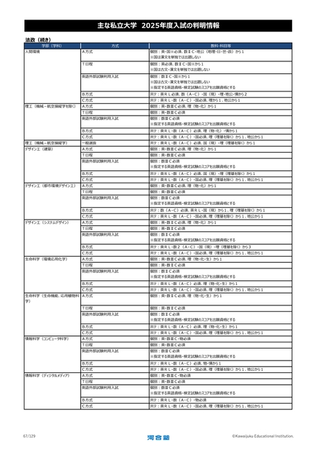 法政(続き)学部(学科)人間環境理工(機械-航空操縦学を除く)理工(機械-航空操縦学)デザイン工(建築)デザイン工(都市環境デザイン工)デザイン工(システムデザイン)生命科学(環境応用化学)生命科学(生命機能、応用植物科学)情報科学(コンピュータ科学)情報科学(ディジタルメディア)主な私立大学2025年度入試の判明情報方式教科・科目等A方式T日程英語外部試験利用入試B方式C方式A方式T日程英語外部試験利用入試B方式C方式一般選抜A方式T日程英語外部試験利用入試B方式C方式A方式T日程英語外部試験利用入試B方式C方式A方式T日程英語外部試験利用入試B方式C方式A方式T日程英語外部試験利用入試B方式C方式A方式T日程英語外部試験利用入試B方式C方式A方式T日程英語外部試験利用入試B方式C方式A方式T日程英語外部試験利用入試B方式C方式個別:英・国※必須、数ⅡC・地公(地理・日・世・政)から1※国は漢文を単独では出題しない個別:英必須、数ⅡC・国※から1※国は古文・漢文を単独では出題しない個別:数ⅡC・国※から1※国は古文・漢文を単独では出題しない※指定する英語資格・検定試験のスコアを出願資格とする共テ:英RL必須、数(A・C)・国(現)・理・地公・情から2共テ:英RL・数(A・C)・国必須、理から1、地公から1個別:英・数ⅢC必須、理(物・化)から1個別:英・数ⅢC必須個別:数ⅢC必須※指定する英語資格・検定試験のスコアを出願資格とする共テ:英RL・数(A・C)必須、理(物・化)・情から1共テ:英RL・数(A・C)・国必須、理(理基を除く)から1、地公から1共テ:英RL・数(A・C)必須、国(現)・理(理基を除く)から1個別:英・数ⅢC必須、理(物・化)から1個別:英・数ⅢC必須個別:数ⅢC必須※指定する英語資格・検定試験のスコアを出願資格とする共テ:英RL・数(A・C)必須、国(現)・理(理基を除く)から1共テ:英RL・数(A・C)・国必須、理(理基を除く)から1、地公から1個別:英・数ⅢC必須、理(物・化)から1個別:英・数ⅢC必須個別:数ⅢC必須※指定する英語資格・検定試験のスコアを出願資格とする共テ:数(A・C)必須、英RL・国(現)から1、理(理基を除く)から1共テ:英RL・数(A・C)・国必須、理(理基を除く)から1、地公から1個別:英・数ⅡC必須、理(物・化)から1個別:英・数ⅡC必須個別:数ⅡC必須※指定する英語資格・検定試験のスコアを出願資格とする共テ:英RL・数2(A・C)・国(現)・理(理基を除く)から3共テ:英RL・数(A・C)・国必須、理(理基を除く)から1、地公から1個別:英・数ⅢC必須、理(物・化・生)から1個別:英・数ⅡC必須個別:数ⅡC必須※指定する英語資格・検定試験のスコアを出願資格とする共テ:英RL・数(A・C)必須、理(物・化・生)から1共テ:英RL・数(A・C)・国必須、理(理基を除く)から1、地公から1個別:英・数ⅡC必須、理(物・化・生)から1個別:英・数ⅡC必須個別:数ⅡC必須※指定する英語資格・検定試験のスコアを出願資格とする共テ:英RL・数(A・C)必須、理(物・化・生)から1共テ:英RL・数(A・C)・国必須、理(理基を除く)から1、地公から1個別:英・数ⅢC・物必須個別:英・数ⅢC必須個別:数ⅢC必須※指定する英語資格・検定試験のスコアを出願資格とする共テ:英RL・数(A・C)必須、物・情から1共テ:英RL・数(A・C)・国必須、理(理基を除く)から1、地公から1個別:英・数ⅢC・物必須個別:英・数ⅢC必須個別:数ⅢC必須※指定する英語資格・検定試験のスコアを出願資格とする共テ:英RL・数(A・C)・物必須共テ:英RL・数(A・C)・国必須、理(理基を除く)から1、地公から167/129©KawaijukuEducationalInstitution.