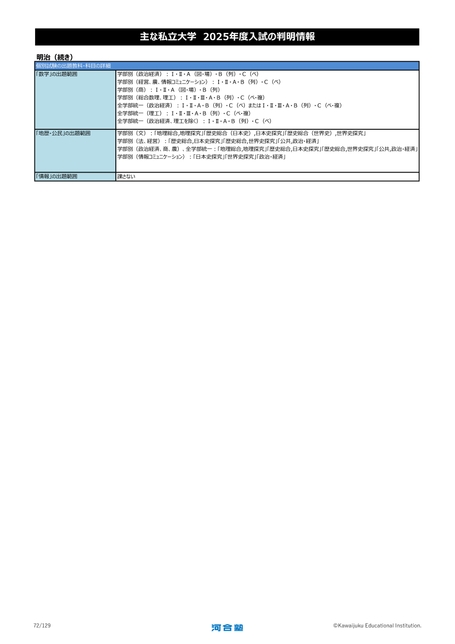 明治(続き)個別試験の出題教科・科目の詳細「数学」の出題範囲主な私立大学2025年度入試の判明情報学部別(政治経済):Ⅰ・Ⅱ・A(図・場)・B(列)・C(ベ)学部別(経営、農、情報コミュニケーション):Ⅰ・Ⅱ・A・B(列)・C(ベ)学部別(商):Ⅰ・Ⅱ・A(図・場)・B(列)学部別(総合数理、理工):Ⅰ・Ⅱ・Ⅲ・A・B(列)・C(ベ・複)全学部統一(政治経済):Ⅰ・Ⅱ・A・B(列)・C(ベ)またはⅠ・Ⅱ・Ⅲ・A・B(列)・C(ベ・複)全学部統一(理工):Ⅰ・Ⅱ・Ⅲ・A・B(列)・C(ベ・複)全学部統一(政治経済、理工を除く):Ⅰ・Ⅱ・A・B(列)・C(ベ)「地歴・公民」の出題範囲学部別(文):「地理総合,地理探究」「歴史総合(日本史),日本史探究」「歴史総合(世界史),世界史探究」学部別(法、経営):「歴史総合,日本史探究」「歴史総合,世界史探究」「公共,政治・経済」学部別(政治経済、商、農)、全学部統一:「地理総合,地理探究」「歴史総合,日本史探究」「歴史総合,世界史探究」「公共,政治・経済」学部別(情報コミュニケーション):「日本史探究」「世界史探究」「政治・経済」「情報」の出題範囲課さない72/129©KawaijukuEducationalInstitution.