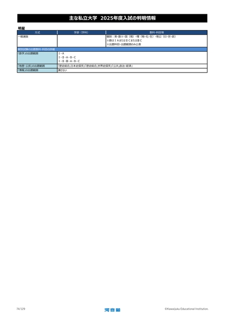 主な私立大学2025年度入試の判明情報明星一般選抜方式学部(学科)教科・科目等個別:英・数※・国(現)・理(物・化・生)・地公(日・世・政)※数はⅠAまたはⅡCまたはⅢC※出題科目・出題範囲のみ公表個別試験の出題教科・科目の詳細「数学」の出題範囲Ⅰ・AⅠ・Ⅱ・A・B・CⅠ・Ⅱ・Ⅲ・A・B・C「地歴・公民」の出題範囲「情報」の出題範囲「歴史総合,日本史探究」「歴史総合,世界史探究」「公共,政治・経済」課さない74/129©KawaijukuEducationalInstitution.