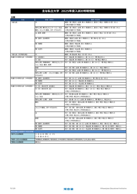 主な私立大学2025年度入試の判明情報立教一般入試方式学部(学科)教科・科目等文個別:国(現古)必須、英※・英資から1、数ⅡC・地公(地理・日・世)から1※英は共通テスト「英語」現代心理、異文化コミュニケーション、社会、観光、コミュニティ福祉、スポーツウエルネス個別:国(現古)必須、英※・英資から1、数ⅡC・地公(地理・日・世・政)から1※英は共通テスト「英語」法、経済、経営理(数学、生命理学)理(物理)理(化学)個別:国(現古)必須、英※・英資から1、数ⅡC・地公(日・世・政)から1※英は共通テスト「英語」個別:数ⅢC必須、英※・英資から1、理(物・化・生)から1※英は共通テスト「英語」個別:数ⅢC・物必須、英※・英資から1※英は共通テスト「英語」個別:数ⅢC・化必須、英※・英資から1※英は共通テスト「英語」文文(史を除く)文(史)現代心理(映像身体)、異文化コミュニケーション、社会、観光、経済経営法現代心理(心理)、コミュニティ福祉、スポーツウエルネス理(数学、生命理学)理(物理)理(化学)文(文-英米文学、史を除く)文(文-英米文学、史)個別:英・国必須、地公(日・世)から1共テ:国必須、英・英資から1、数(A・C)・理・地公から1共テ:国必須、英・英資から1、数(A・C)・理・地公・情から1共テ:国(現古)必須、英・英資から1、数(A・C)・理・地公・情から1共テ:国(現)必須、英・英資から1、数(A・C)・地公・情から1共テ:国(現古)必須、英・英資から1、数(A・C)・理・地公から1共テ:国(現)必須、英・英資から1、数(A・C)・理・地公・情から1共テ:数(A・C)必須、英・英資から1、理(物・化・生)から1共テ:数(A・C)・物必須、英・英資から1共テ:数(A・C)・化必須、英・英資から1共テ:国必須、英・英資から1、数2(A・C)・理2・地公2・情から4共テ:国必須、英・英資から1、数2(A・C)・理2・地2・情から4※地公1科目を含むこと現代心理(映像身体)、異文化コミュニケーション、社会共テ:国・数A必須、英・英資から1、数C・理2・地公2・情から3※理1科目、地公から1科目を含むこと現代心理(心理)、経済観光コミュニティ福祉、スポーツウエルネス法経営理(数学、生命理学)理(物理)理(化学)Ⅰ・Ⅱ・A・B(列)・C(ベ)Ⅰ・Ⅱ・Ⅲ・A・B・C共テ:国・数(A・C)必須、英・英資から1、理・情から1、地公から1共テ:国(現古)・数A必須、英・英資から1、数C・理2・地公2・情から3※地公1科目を含むこと共テ:国(現)・数A必須、英・英資から1、数C・理2・地公2・情から3※理1科目、地公から1科目を含むこと共テ:国(現古)・数A必須、英・英資から1、数C・理2・地公2・情から3※理1科目、地公から1科目を含むこと共テ:国(現)・数A必須、英・英資から1、数C・理2・地公2・情から3※地公1科目を含むこと共テ:国(現)・数(A・C)必須、英・英資から1、理2(物・化・生)・情から2共テ:国(現)・数(A・C)・物必須、英・英資から1、理(化・生・地学)・情から1共テ:国(現)・数(A・C)・化必須、英・英資から1、理(物・生・地学)・情から1一般入試(文学部日程)共通テスト利用入試(3科目型)共通テスト利用入試(4科目型)共通テスト利用入試(6科目型)個別試験の出題教科・科目の詳細「数学」の出題範囲「地歴・公民」の出題範囲「情報」の出題範囲「地理総合,地理探究」「歴史総合,日本史探究」「歴史総合,世界史探究」「公共,政治・経済」課さない75/129©KawaijukuEducationalInstitution.