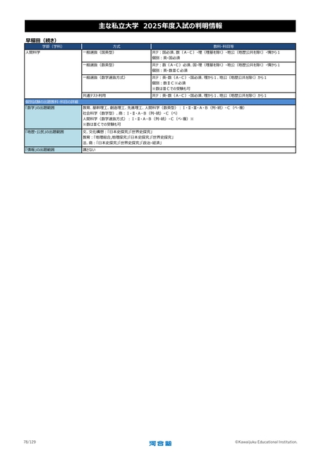 早稲田(続き)学部(学科)人間科学主な私立大学2025年度入試の判明情報方式一般選抜(国英型)一般選抜(数英型)一般選抜(数学選抜方式)教科・科目等共テ:国必須、数(A・C)・理(理基を除く)・地公(地歴公共を除く)・情から1個別:英・国必須共テ:数(A・C)必須、国・理(理基を除く)・地公(地歴公共を除く)・情から1個別:英・数ⅢC必須共テ:英・数(A・C)・国必須、理から1、地公(地歴公共を除く)から1個別:数ⅡC※必須※数はⅢCでの受験も可共通テスト利用共テ:英・数(A・C)・国必須、理から1、地公(地歴公共を除く)から1個別試験の出題教科・科目の詳細「数学」の出題範囲教育、基幹理工、創造理工、先進理工、人間科学(数英型):Ⅰ・Ⅱ・Ⅲ・A・B(列・統)・C(ベ・複)社会科学(数学型)、商:Ⅰ・Ⅱ・A・B(列・統)・C(ベ)人間科学(数学選抜方式):Ⅰ・Ⅱ・A・B(列・統)・C(ベ・複)※※数はⅢCでの受験も可「地歴・公民」の出題範囲文、文化構想:「日本史探究」「世界史探究」教育:「地理総合,地理探究」「日本史探究」「世界史探究」法、商:「日本史探究」「世界史探究」「政治・経済」「情報」の出題範囲課さない78/129©KawaijukuEducationalInstitution.