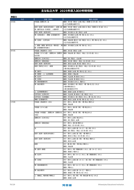 神奈川A方式方式B方式C方式主な私立大学2025年度入試の判明情報学部(学科)外国語、国際日本、法個別:英・国(現古)必須、地公(地理・日・世・政)から1※2/7は地理の選択不可教科・科目等経済(経済-経済分析を除く)、経営、建築(都市生活ー文系型)、人間科学個別:英・国(現古)必須、数ⅡA・地公(地理・日・世・政)から1※2/7は地理の選択不可経済(経済-経済分析)理(生物を除く)、情報(計算機科学)個別:英・数ⅡA・国(現古)必須個別:英・数ⅢC必須、理(物・化・生)から1※2/7は生の選択不可理(生物)、化学生命工、建築(建築、都市生活-理系型)、情報(計算機科学を除く)外国語(英語英文-IES)外国語(スペイン語)、国際日本(国際文化交流)国際日本(日本文化)国際日本(歴史民俗)経済(経済-経済分析)経済(現代ビジネス)、経営理(数学)理(物理)、工(応用物理)理(化学)理(生物)理(地球環境科学)理(総合理学)工(応用物理を除く)化学生命(応用化学)化学生命(生命機能)情報(計算機科学)外国語(英語英文-IES)外国語(スペイン語)個別:英必須、数ⅡC・国(現古)から1、理(物・化・生)から1※2/7は生の選択不可個別:英・数ⅢC必須、理(物・化)から1個別:英・国(現古)必須個別:英必須、国(現古)・地公(日・世・政)から1個別:国(現古)・日必須個別:英・国(現古)・地公(日・世・政)から2個別:数ⅡA必須、英・国(現古)から1個別:英・数ⅡA・国(現古)・地公(日・世・政)から2※数・地公の組合せ不可個別:数ⅢC必須、理(物・化・生)から1個別:数ⅢC・物必須個別:化必須、英・数ⅡCから1個別:生必須、英・数ⅡCから1個別:英・数ⅡCから1、理から1個別:英・数ⅢC・国(現古)・理(物・化・生)から2※数か理を含むこと※数・国の組合せ不可個別:数ⅢC必須、英・物から1個別:化必須、英・数ⅡC・国(現古)から1個別:英・数ⅡC・国(現古)から1、理(化・生)から1個別:数ⅡC必須、英・理(物・化・生)から1共テ:英RL・数・国(現)・理・地公・情から2個別:英必須共テ:英RL・数・国(現)・理・地公から1個別:英必須外国語(中国語)、国際日本(国際文化交流)共テ:英RL・数・国(現)・理・地公から2個別:英必須国際日本(日本文化)国際日本(歴史民俗)法経済(経済-経済分析を除く)経済(経済-経済分析)経営理(数学、物理)理(化学)理(生物)理(地球環境科学)理(総合理学)工(機械工、電気電子情報工)共テ:英RL必須、地公から1個別:国(現古)必須共テ:英RL・数・国・理から2個別:地公(日・世・政)から1共テ:英RL必須、数(A・C)・国(現)から1個別:国(現古)・地公(日・世・政)から1共テ:英RL必須、国(現)・理・情から1個別:数ⅡA・地公(日・世・政)から1共テ:英RL必須、国(現)・理・地公・情から1個別:数ⅡA必須共テ:数・国(現)・理・地公・情から1個別:英必須共テ:英RL・理(理基を除く)から1、数(A・C)から1個別:数ⅢC・物から1共テ:英RL・数(A・C)から1、理(理基を除く)から1個別:化必須共テ:英RL必須、数(A・C)・国(現)・理(理基を除く)から1個別:生必須共テ:英RL・数(A・C)から1、理(理基を除く)から1個別:理から1共テ:英RL必須、数(A・C)・理から1個別:数ⅢC・理(物・化・生)から1共テ:英RL・国(現)・理(物化基・物・化)から2個別:数ⅢC必須79/129©KawaijukuEducationalInstitution.