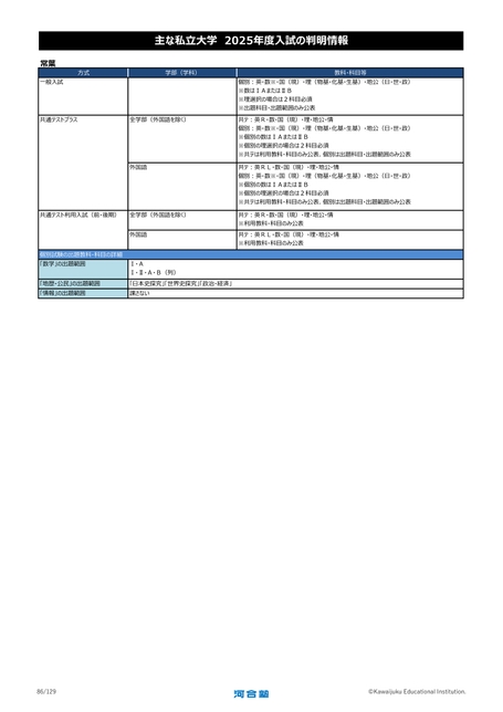 主な私立大学2025年度入試の判明情報方式学部(学科)教科・科目等常葉一般入試個別:英・数※・国(現)・理(物基・化基・生基)・地公(日・世・政)※数はⅠAまたはⅡB※理選択の場合は2科目必須※出題科目・出題範囲のみ公表共テ:英R・数・国(現)・理・地公・情個別:英・数※・国(現)・理(物基・化基・生基)・地公(日・世・政)※個別の数はⅠAまたはⅡB※個別の理選択の場合は2科目必須※共テは利用教科・科目のみ公表、個別は出題科目・出題範囲のみ公表共テ:英RL・数・国(現)・理・地公・情個別:英・数※・国(現)・理(物基・化基・生基)・地公(日・世・政)※個別の数はⅠAまたはⅡB※個別の理選択の場合は2科目必須※共テは利用教科・科目のみ公表、個別は出題科目・出題範囲のみ公表共テ:英R・数・国(現)・理・地公・情※利用教科・科目のみ公表共テ:英RL・数・国(現)・理・地公・情※利用教科・科目のみ公表共通テストプラス全学部(外国語を除く)外国語共通テスト利用入試(前・後期)全学部(外国語を除く)個別試験の出題教科・科目の詳細「数学」の出題範囲外国語Ⅰ・AⅠ・Ⅱ・A・B(列)「地歴・公民」の出題範囲「情報」の出題範囲「日本史探究」「世界史探究」「政治・経済」課さない86/129©KawaijukuEducationalInstitution.