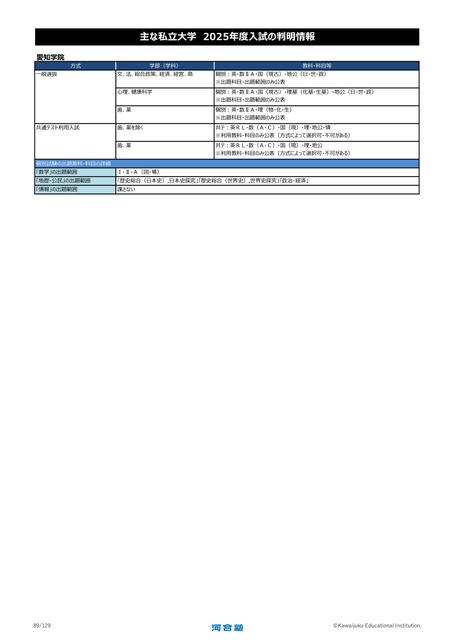 主な私立大学2025年度入試の判明情報愛知学院一般選抜方式学部(学科)文、法、総合政策、経済、経営、商個別:英・数ⅡA・国(現古)・地公(日・世・政)※出題科目・出題範囲のみ公表教科・科目等心理、健康科学歯、薬共通テスト利用入試歯、薬を除く歯、薬個別:英・数ⅡA・国(現古)・理基(化基・生基)・地公(日・世・政)※出題科目・出題範囲のみ公表個別:英・数ⅡA・理(物・化・生)※出題科目・出題範囲のみ公表共テ:英RL・数(A・C)・国(現)・理・地公・情※利用教科・科目のみ公表(方式によって選択可・不可がある)共テ:英RL・数(A・C)・国(現)・理・地公※利用教科・科目のみ公表(方式によって選択可・不可がある)個別試験の出題教科・科目の詳細「数学」の出題範囲「地歴・公民」の出題範囲「情報」の出題範囲Ⅰ・Ⅱ・A(図・場)「歴史総合(日本史),日本史探究」「歴史総合(世界史),世界史探究」「政治・経済」課さない89/129©KawaijukuEducationalInstitution.