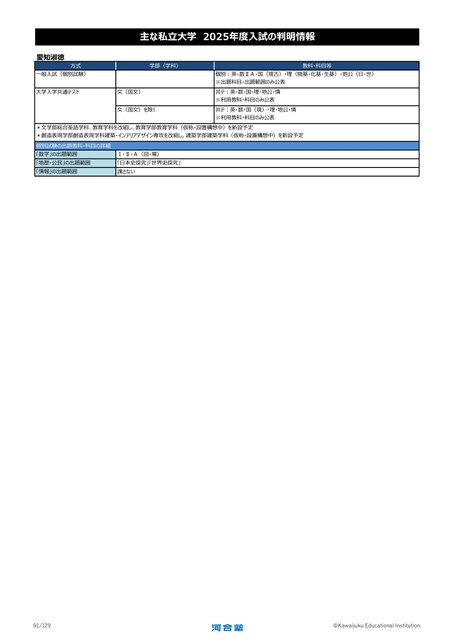 主な私立大学2025年度入試の判明情報愛知淑徳方式一般入試(個別試験)学部(学科)教科・科目等個別:英・数ⅡA・国(現古)・理(物基・化基・生基)・地公(日・世)※出題科目・出題範囲のみ公表大学入学共通テスト文(国文)文(国文)を除く共テ:英・数・国・理・地公・情※利用教科・科目のみ公表共テ:英・数・国(現)・理・地公・情※利用教科・科目のみ公表*文学部総合英語学科、教育学科を改組し、教育学部教育学科(仮称・設置構想中)を新設予定*創造表現学部創造表現学科建築・インテリアデザイン専攻を改組し、建築学部建築学科(仮称・設置構想中)を新設予定個別試験の出題教科・科目の詳細「数学」の出題範囲「地歴・公民」の出題範囲「情報」の出題範囲Ⅰ・Ⅱ・A(図・場)「日本史探究」「世界史探究」課さない91/129©KawaijukuEducationalInstitution.