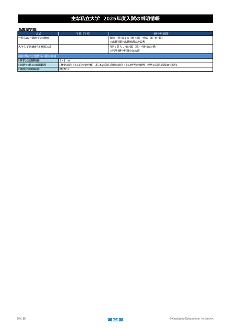 名古屋学院方式一般入試(個別学力試験)大学入学共通テスト利用入試個別試験の出題教科・科目の詳細「数学」の出題範囲「地歴・公民」の出題範囲「情報」の出題範囲主な私立大学2025年度入試の判明情報学部(学科)教科・科目等個別:英・数ⅡA・国(現)・地公(日・世・政)※出題科目・出題範囲のみ公表共テ:英RL・数・国(現)・理・地公・情※利用教科・科目のみ公表Ⅰ・Ⅱ・A「歴史総合(主に日本史分野),日本史探究」「歴史総合(主に世界史分野),世界史探究」「政治・経済」課さない95/129©KawaijukuEducationalInstitution.