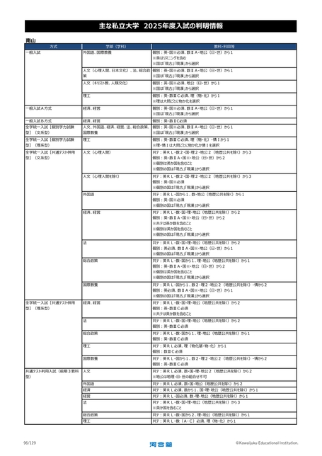 主な私立大学2025年度入試の判明情報南山一般入試方式学部(学科)外国語、国際教養教科・科目等個別:英・国※必須、数ⅡA・地公(日・世)から1※英はリスニングを含む※国は「現古」「現漢」から選択人文(心理人間、日本文化)、法、総合政策個別:英・国※必須、数ⅡA・地公(日・世)から1※国は「現古」「現漢」から選択人文(キリスト教、人類文化)理工一般入試A方式経済、経営個別:英・国※必須、地公(日・世)から1※国は「現古」「現漢」から選択個別:英・数ⅢC必須、理(物・化)から1※理は大問ごとに物か化を選択個別:英・国※必須、数ⅡA・地公(日・世)から1※国は「現古」「現漢」から選択経済、経営人文、外国語、経済、経営、法、総合政策、国際教養個別:英・数ⅡC必須個別:英・国※必須、数ⅡA・地公(日・世)から1※国は「現古」「現漢」から選択一般入試B方式全学統一入試[個別学力試験型](文系型)全学統一入試[個別学力試験型](理系型)全学統一入試[共通テスト併用型](文系型)理工人文(心理人間)人文(心理人間を除く)外国語経済、経営法総合政策国際教養個別:英・数ⅢC必須、理(物・化)・情Ⅰから1※理・情Ⅰは大問ごとに物か化か情Ⅰを選択共テ:英RL・数2・国・理2・地公2(地歴公共を除く)から3個別:英・数ⅡA・国※・地公(日・世)から2※個別は英か国を含むこと※個別の国は「現古」「現漢」から選択共テ:英RL・数2・国・理2・地公2(地歴公共を除く)から3個別:英・国※必須※個別の国は「現古」「現漢」から選択共テ:英RL・国から1、数・地公(地歴公共を除く)から1個別:英・国※必須※個別の国は「現古」「現漢」から選択共テ:英RL・数・国・理・地公(地歴公共を除く)から2個別:英・数ⅡA・国※・地公(日・世)から2※共テは英か数を含むこと※個別は英か国を含むこと※個別の国は「現古」「現漢」から選択共テ:英RL・数・国・理・地公(地歴公共を除く)から2個別:英必須、数ⅡA・国※・地公(日・世)から1※個別の国は「現古」「現漢」から選択共テ:英RL・数・国から1、理・地公(地歴公共を除く)から1個別:英・数ⅡA・国※・地公(日・世)から2※個別は英か国を含むこと※個別の国は「現古」「現漢」から選択共テ:英RL・国から1、数2・理2・地公2(地歴公共を除く)・情から2個別:英必須、数ⅡA・国※・地公(日・世)から1※個別の国は「現古」「現漢」から選択共テ:英RL・数・国・理・地公(地歴公共を除く)から2個別:英・数ⅢC必須※共テは英か数を含むこと共テ:英RL・数・国・理・地公(地歴公共を除く)から2個別:英・数ⅢC必須共テ:英RL・数・国から1、理・地公(地歴公共を除く)から1個別:英・数ⅢC必須共テ:英RL必須、理(物化基・物・化)から1個別:数ⅢC必須共テ:英RL・国から1、数2・理2・地公2(地歴公共を除く)・情から2個別:英・数ⅢC必須共テ:英RL必須、数・国・理・地公2(地歴公共を除く)から2※地公は地理・日・世の組合せ不可共テ:英RL必須、数・国・地公(地歴公共を除く)から2共テ:英RL必須、数から1、国・理・地公(地歴公共を除く)から1共テ:英RL・国必須、数・理・地公(地歴公共を除く)から1共テ:英RL・数・国・理・地公(地歴公共を除く)から3※英か国を含むこと共テ:英RL・数・国から2、理・地公(地歴公共を除く)から1共テ:英RL・数(A・C)必須、理(物・化)から1全学統一入試[共通テスト併用型](理系型)経済、経営法総合政策理工国際教養共通テスト利用入試(前期3教科型)人文外国語経済経営法総合政策理工96/129©KawaijukuEducationalInstitution.