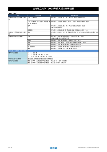 主な私立大学2025年度入試の判明情報南山(続き)方式共通テスト利用入試(前期5教科型)学部(学科)教科・科目等人文(人類文化)共テ:英RL・国必須、数2・理2・地公2(地歴公共を除く)から3人文(心理人間、日本文化)、外国語、経営、法、総合政策共テ:英RL・国必須、数から1、理から1、地公(地歴公共を除く)から1経済国際教養理工共通テスト利用入試(前期6教科型)共通テスト利用入試(後期)人文外国語経済経営法、総合政策理工共テ:英RL・国必須、数2・理2・地公(地歴公共を除く)から3※数1科目を含むこと共テ:英RL・国必須、数・理・情から2、地公(地歴公共を除く)から1共テ:英RL・数(A・C)・国・情必須、理(物・化)から1、地公(地歴公共を除く)から1共テ:英RL必須、数・国・理・地公2(地歴公共を除く)から2※地公は地理・日・世の組合せ不可共テ:英RL必須、数・国・地公(地歴公共を除く)から2共テ:英RL必須、数から1、国・理・地公(地歴公共を除く)から1共テ:英RL必須、数・国・理・地公(地歴公共を除く)から2共テ:英RL・国必須、数・理・地公(地歴公共を除く)から1共テ:英RL・数(A・C)必須、理(物・化)から1個別試験の出題教科・科目の詳細「数学」の出題範囲Ⅰ・Ⅱ・A(図・場)Ⅰ・Ⅱ・A(図・場)・B(列)・C(ベ)Ⅰ・Ⅱ・Ⅲ・A(図・場)・B(列)・C(ベ・複)「地歴・公民」の出題範囲「情報」の出題範囲「歴史総合,日本史探究」「歴史総合,世界史探究」理工(全学統一入試[個別学力試験型](理系型)):選択(情報Ⅰ)理工(全学統一入試[個別学力試験型](理系型))を除く:課さない97/129©KawaijukuEducationalInstitution.