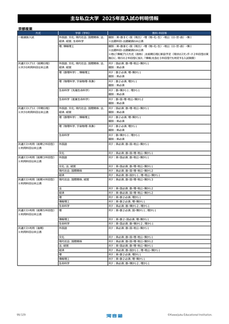 主な私立大学2025年度入試の判明情報京都産業一般選抜入試方式学部(学科)教科・科目等外国語、文化、現代社会、国際関係、法、経済、経営、生命科学個別:英・数ⅡC・国(現古)・理(物・化・生)・地公(日・世・政)・情Ⅰ※出題科目・出題範囲のみ公表理、情報理工個別:英・数ⅢC・国(現古)・理(物・化・生)・地公(日・世・政)・情Ⅰ※出題科目・出題範囲のみ公表※他に「情報プラス方式(仮称)」を前期日程に新設予定(現状のスタンダード2科目型の実施日に、現行の2科目型に加え、「情報」を含む3科目型でも判定する入試制度)共通テストプラス(前期日程)※共テの利用科目は未公表外国語、文化、現代社会、国際関係、法、経済、経営共テ:国必須、数・理・地公・情から1個別:英必須理(数理科学)、情報理工理(物理科学、宇宙物理・気象)生命科学(先端生命科学)生命科学(産業生命科学)共テ:数2必須、理・情から1個別:英必須共テ:数2必須、理から1個別:英必須共テ:数・情から1、理から1個別:英必須共テ:数・国・理・地公・情から2個別:英必須共通テストプラス(中期日程)※共テの利用科目は未公表外国語、文化、現代社会、国際関係、法、経済、経営共テ:国必須、数・理・地公・情から1個別:英必須理(数理科学)、情報理工理(物理科学、宇宙物理・気象)共通テスト利用(前期2科目型)※利用科目は未公表共通テスト利用(前期3科目型)※利用科目は未公表生命科学外国語文化外国語共テ:数2必須、理・情から1個別:英必須共テ:数2必須、理から1個別:英必須共テ:数・情から1、理から1個別:英必須共テ:英必須、数・国・地公・情から1共テ:英必須、数・国・理・地公・情から1共テ:英・国必須、数・地公・情から1共通テスト利用(前期4科目型)※利用科目は未公表共通テスト利用(前期5科目型)※利用科目は未公表共通テスト利用(後期)※利用科目は未公表文化、法、経営現代社会、国際関係経済現代社会、国際関係、経営共テ:英・国必須、数・理・地公・情から1共テ:英必須、数・国・理・地公・情から2共テ:英必須、数・国から1、理・地公・情から1共テ:英必須、数・国・理・地公・情から3法経済理情報理工生命科学理情報理工生命科学外国語文化現代社会、国際関係法、経営経済理情報理工生命科学共テ:英・国必須、数・理・地公・情から2共テ:英・数必須、国・理・地公・情から2共テ:英・数2必須、理から1共テ:英・数2必須、理・情から1共テ:英必須、数・情から2、理から1共テ:英・数2必須、国・情から1、理から1共テ:英・数2・国必須、理・情から1共テ:英・国必須、数・情から2、理から1共テ:英必須、数・国・地公・情から1共テ:英必須、数・国・理・地公・情から1共テ:英必須、数・国・理・地公・情から2共テ:英・国必須、数・理・地公・情から1共テ:英必須、数・国から1、理・地公・情から1共テ:英・数2必須、理から1共テ:英・数2必須、理・情から1共テ:英必須、数・情から2、理から199/129©KawaijukuEducationalInstitution.