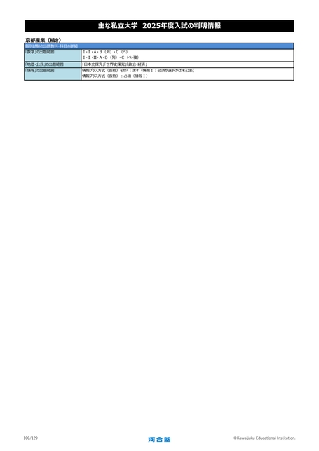 主な私立大学2025年度入試の判明情報京都産業(続き)個別試験の出題教科・科目の詳細「数学」の出題範囲Ⅰ・Ⅱ・A・B(列)・C(ベ)Ⅰ・Ⅱ・Ⅲ・A・B(列)・C(ベ・複)「地歴・公民」の出題範囲「情報」の出題範囲「日本史探究」「世界史探究」「政治・経済」情報プラス方式(仮称)を除く:課す(情報Ⅰ:必須か選択かは未公表)情報プラス方式(仮称):必須(情報Ⅰ)100/129©KawaijukuEducationalInstitution.
