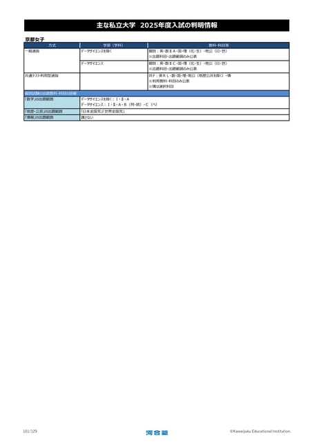 主な私立大学2025年度入試の判明情報京都女子一般選抜方式共通テスト利用型選抜学部(学科)データサイエンスを除くデータサイエンス教科・科目等個別:英・数ⅡA・国・理(化・生)・地公(日・世)※出題科目・出題範囲のみ公表個別:英・数ⅡC・国・理(化・生)・地公(日・世)※出題科目・出題範囲のみ公表共テ:英RL・数・国・理・地公(地歴公共を除く)・情※利用教科・科目のみ公表※情は選択科目個別試験の出題教科・科目の詳細「数学」の出題範囲データサイエンスを除く:Ⅰ・Ⅱ・Aデータサイエンス:Ⅰ・Ⅱ・A・B(列・統)・C(ベ)「地歴・公民」の出題範囲「情報」の出題範囲「日本史探究」「世界史探究」課さない101/129©KawaijukuEducationalInstitution.