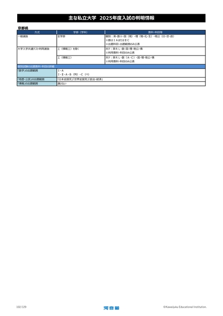 主な私立大学2025年度入試の判明情報京都橘一般選抜方式学部(学科)全学部大学入学共通テスト利用選抜工(情報工)を除く工(情報工)個別試験の出題教科・科目の詳細「数学」の出題範囲「地歴・公民」の出題範囲「情報」の出題範囲Ⅰ・AⅠ・Ⅱ・A・B(列)・C(ベ)「日本史探究」「世界史探究」「政治・経済」課さない教科・科目等個別:英・数※・国(現)・理(物・化・生)・地公(日・世・政)※数はⅠAまたはⅡC※出題科目・出題範囲のみ公表共テ:英RL・数・国・理・地公・情※利用教科・科目のみ公表共テ:英RL・数(A・C)・国・理・地公・情※利用教科・科目のみ公表102/129©KawaijukuEducationalInstitution.