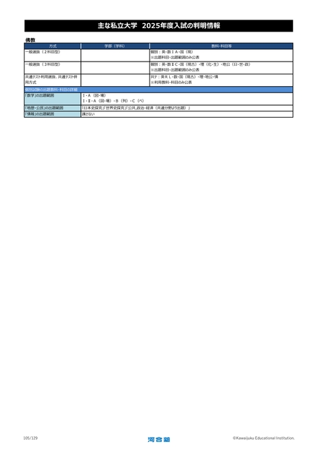 佛教方式一般選抜(2科目型)一般選抜(3科目型)共通テスト利用選抜、共通テスト併用方式個別試験の出題教科・科目の詳細「数学」の出題範囲「地歴・公民」の出題範囲「情報」の出題範囲主な私立大学2025年度入試の判明情報学部(学科)教科・科目等個別:英・数ⅠA・国(現)※出題科目・出題範囲のみ公表個別:英・数ⅡC・国(現古)・理(化・生)・地公(日・世・政)※出題科目・出題範囲のみ公表共テ:英RL・数・国(現古)・理・地公・情※利用教科・科目のみ公表Ⅰ・A(図・場)Ⅰ・Ⅱ・A(図・場)・B(列)・C(ベ)「日本史探究」「世界史探究」「公共,政治・経済(共通分野より出題)」課さない105/129©KawaijukuEducationalInstitution.