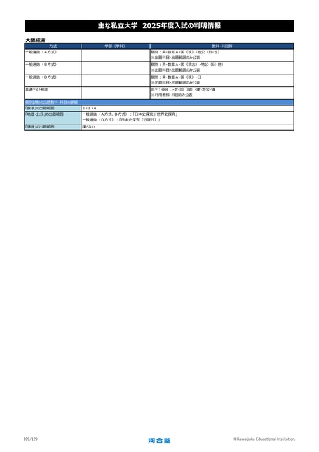 大阪経済方式一般選抜(A方式)一般選抜(B方式)一般選抜(D方式)共通テスト利用主な私立大学2025年度入試の判明情報学部(学科)教科・科目等個別:英・数ⅡA・国(現)・地公(日・世)※出題科目・出題範囲のみ公表個別:英・数ⅡA・国(現古)・地公(日・世)※出題科目・出題範囲のみ公表個別:英・数ⅡA・国(現)・日※出題科目・出題範囲のみ公表共テ:英RL・数・国(現)・理・地公・情※利用教科・科目のみ公表個別試験の出題教科・科目の詳細「数学」の出題範囲「地歴・公民」の出題範囲Ⅰ・Ⅱ・A一般選抜(A方式、B方式):「日本史探究」「世界史探究」一般選抜(D方式):「日本史探究(近現代)」「情報」の出題範囲課さない109/129©KawaijukuEducationalInstitution.