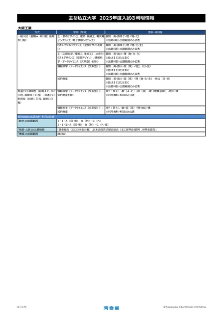 主な私立大学2025年度入試の判明情報大阪工業方式学部(学科)教科・科目等一般入試(前期A・B日程、後期D日程)工(都市デザイン工、建築、機械工、電気電子システム工、電子情報システム工)個別:英・数ⅢC・理(物・化)※出題科目・出題範囲のみ公表ロボティクス&デザイン工(空間デザインを除く)個別:英・数ⅢC・理(物・化・生)※出題科目・出題範囲のみ公表工(応用化学、環境工、生命工)、ロボティクス&デザイン工(空間デザイン)、情報科学(データサイエンス(文系型)を除く)個別:英・数※・理(物・化・生)※数はⅡCまたはⅢC※出題科目・出題範囲のみ公表情報科学(データサイエンス(文系型))知的財産個別:英・数※・国(現)・地公(日・世)※数はⅡCまたはⅢC※出題科目・出題範囲のみ公表個別:英・数※・国(現)・理(物・化・生)・地公(日・世)※数はⅡCまたはⅢC※出題科目・出題範囲のみ公表情報科学(データサイエンス(文系型))、知的財産を除く共テ:英RL・数(A・C)・国(現)・理(理基を除く)・地公・情※利用教科・科目のみ公表情報科学(データサイエンス(文系型))、知的財産共テ:英RL・数・国(現)・理・地公・情※利用教科・科目のみ公表Ⅰ・Ⅱ・A(図・場)・B(列)・C(ベ)Ⅰ・Ⅱ・Ⅲ・A(図・場)・B(列)・C(ベ・複)「歴史総合(主に日本史分野),日本史探究」「歴史総合(主に世界史分野),世界史探究」課さない共通テスト併用型(前期AC・BC日程、後期DC日程)、共通テスト利用型(前期C日程、後期C日程)個別試験の出題教科・科目の詳細「数学」の出題範囲「地歴・公民」の出題範囲「情報」の出題範囲111/129©KawaijukuEducationalInstitution.