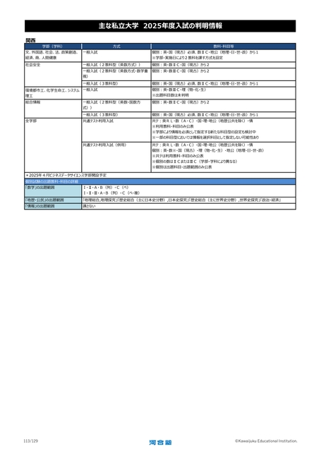 主な私立大学2025年度入試の判明情報関西学部(学科)方式文、外国語、社会、法、政策創造、経済、商、人間健康一般入試個別:英・国(現古)必須、数ⅡC・地公(地理・日・世・政)から1※学部・実施日により2教科を課す方式を設定教科・科目等社会安全一般入試(2教科型(英数方式))一般入試(2教科型(英数方式・数学重視)個別:英・数ⅡC・国(現古)から2個別:英・数ⅢC・国(現古)から2環境都市工、化学生命工、システム理工一般入試(3教科型)一般入試総合情報全学部一般入試(2教科型(英数・国数方式))一般入試(3教科型)共通テスト利用入試共通テスト利用入試(併用)*2025年4月ビジネスデータサイエンス学部開設予定個別試験の出題教科・科目の詳細「数学」の出題範囲Ⅰ・Ⅱ・A・B(列)・C(べ)Ⅰ・Ⅱ・Ⅲ・A・B(列)・C(ベ・複)個別:英・国(現古)必須、数ⅡC・地公(地理・日・世・政)から1個別:英・数ⅢC・理(物・化・生)※出題科目数は未判明個別:英・数ⅡC・国(現古)から2個別:英・国(現古)必須、数ⅡC・地公(地理・日・世・政)から1共テ:英RL・数(A・C)・国・理・地公(地歴公共を除く)・情※利用教科・科目のみ公表※学部により情報を必須として指定する新たな科目型の設定も検討中※一部の科目型においては情報を選択科目として指定しない可能性あり共テ:英RL・数(A・C)・国・理・地公(地歴公共を除く)・情個別:英・数※・国(現古)・理(物・化・生)・地公(地理・日・世・政)※共テは利用教科・科目のみ公表※個別の数はⅡCまたはⅢC(学部・学科により異なる)※個別は出題科目・出題範囲のみ公表「地歴・公民」の出題範囲「情報」の出題範囲「地理総合,地理探究」「歴史総合(主に日本史分野),日本史探究」「歴史総合(主に世界史分野),世界史探究」「政治・経済」課さない113/129©KawaijukuEducationalInstitution.