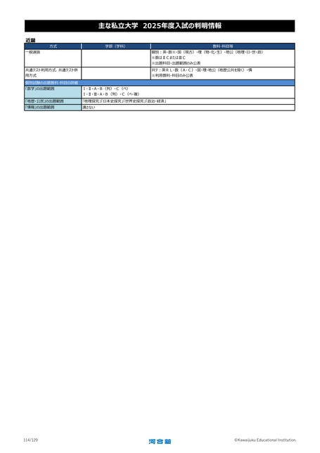 主な私立大学2025年度入試の判明情報方式学部(学科)教科・科目等個別:英・数※・国(現古)・理(物・化・生)・地公(地理・日・世・政)※数はⅡCまたはⅢC※出題科目・出題範囲のみ公表共テ:英RL・数(A・C)・国・理・地公(地歴公共を除く)・情※利用教科・科目のみ公表Ⅰ・Ⅱ・A・B(列)・C(ベ)Ⅰ・Ⅱ・Ⅲ・A・B(列)・C(ベ・複)「地理探究」「日本史探究」「世界史探究」「政治・経済」課さない近畿一般選抜共通テスト利用方式、共通テスト併用方式個別試験の出題教科・科目の詳細「数学」の出題範囲「地歴・公民」の出題範囲「情報」の出題範囲114/129©KawaijukuEducationalInstitution.