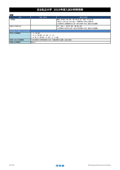 摂南一般選抜共通テスト利用入試個別試験の出題教科・科目の詳細「数学」の出題範囲主な私立大学2025年度入試の判明情報方式学部(学科)教科・科目等個別:英・数※・国(現)・理(物・化・生)・地公(日・世・政)※数はⅠAまたはⅡCまたはⅢC(受験学部・学科により異なる)※出題科目・出題範囲のみ公表(現行の教科・科目、選抜方法を踏襲)共テ:英RL:数・国(現)・理・地公・情※利用教科・科目のみ公表(現行の利用教科・科目、選抜方式を踏襲)Ⅰ・A(図・場)Ⅰ・Ⅱ・A(図・場)・B(列)・C(ベ)Ⅰ・Ⅱ・Ⅲ・A(図・場)・B(列)・C(ベ・複)「地歴・公民」の出題範囲「情報」の出題範囲「日本史探究」「世界史探究」「公共(共通分野から出題),政治・経済」課さない115/129©KawaijukuEducationalInstitution.
