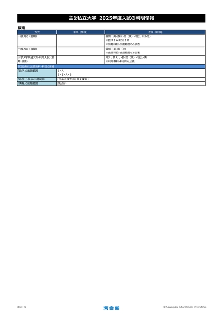 主な私立大学2025年度入試の判明情報学部(学科)教科・科目等個別:英・数※・国(現)・地公(日・世)※数はⅠAまたはⅡB※出題科目・出題範囲のみ公表個別:英・国(現)※出題科目・出題範囲のみ公表共テ:英RL・数・国(現)・地公・情※利用教科・科目のみ公表阪南方式一般入試(前期)一般入試(後期)大学入学共通テスト利用入試(前期・後期)個別試験の出題教科・科目の詳細「数学」の出題範囲Ⅰ・AⅠ・Ⅱ・A・B「地歴・公民」の出題範囲「情報」の出題範囲「日本史探究」「世界史探究」課さない116/129©KawaijukuEducationalInstitution.