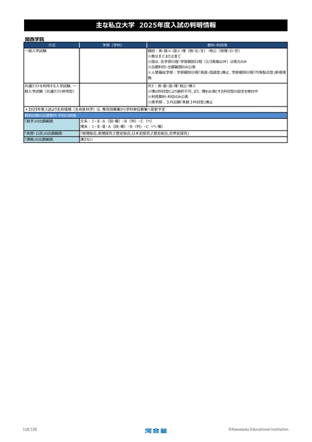 関西学院一般入学試験方式共通テストを利用する入学試験、一般入学試験(共通テスト併用型)主な私立大学2025年度入試の判明情報学部(学科)教科・科目等個別:英・数※・国※・理(物・化・生)・地公(地理・日・世)※数はⅡCまたはⅢC※国は、全学部日程・学部個別日程(2/3実施以外)は現古のみ※出題科目・出題範囲のみ公表※人間福祉学部:学部個別日程「英語・国語型」廃止、学部個別日程「均等配点型」新規実施共テ:英・数・国・理・地公・情※※情は科目型により選択不可、また、情を必須とする科目型の設定を検討中※利用教科・科目のみ公表※商学部:3月出願「英数3科目型」廃止*2025年度入試より生命環境(生命医科学)は、専攻別募集から学科単位募集へ変更予定個別試験の出題教科・科目の詳細「数学」の出題範囲文系:Ⅰ・Ⅱ・A(図・場)・B(列)・C(ベ)理系:Ⅰ・Ⅱ・Ⅲ・A(図・場)・B(列)・C(ベ・複)「地歴・公民」の出題範囲「情報」の出題範囲「地理総合,地理探究」「歴史総合,日本史探究」「歴史総合,世界史探究」課さない118/129©KawaijukuEducationalInstitution.