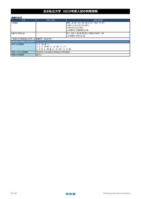 武庫川女子方式一般選抜共通テスト利用入試主な私立大学2025年度入試の判明情報学部(学科)教科・科目等個別:英・数※・国※・理(物・化・生)・地公(日・世)※数はⅠAまたはⅡCまたはⅢC※国は「現」または「現古」※出題科目・出題範囲のみ公表共テ:英RL・数・国・理・地公(地歴公共を除く)・情※利用教科・科目のみ公表*環境共生学部環境共生学科(設置構想中)を新設予定個別試験の出題教科・科目の詳細「数学」の出題範囲「地歴・公民」の出題範囲「情報」の出題範囲Ⅰ・A(図・場・人)Ⅰ・Ⅱ・A(図・場・人)・B(列)・C(ベ)Ⅰ・Ⅱ・Ⅲ・A(図・場・人)・B(列)・C(ベ・複)「歴史総合,日本史探究」「歴史総合,世界史探究」課さない122/129©KawaijukuEducationalInstitution.