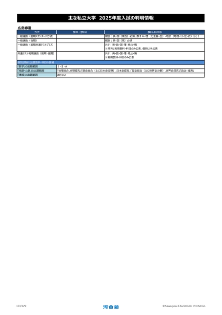 広島修道方式一般選抜(前期スタンダード方式)一般選抜(後期)一般選抜(前期共通テストプラス)共通テスト利用選抜(前期・後期)個別試験の出題教科・科目の詳細「数学」の出題範囲「地歴・公民」の出題範囲「情報」の出題範囲主な私立大学2025年度入試の判明情報学部(学科)教科・科目等個別:英・国(現古)必須、数ⅡA・理(化生基・生)・地公(地理・日・世・政)から1個別:英・国(現)必須共テ:英・数・国・理・地公・情※共テは利用教科・科目のみ公表、個別は未公表共テ:英・数・国・理・地公・情※利用教科・科目のみ公表Ⅰ・Ⅱ・A「地理総合,地理探究」「歴史総合(主に日本史分野),日本史探究」「歴史総合(主に世界史分野),世界史探究」「政治・経済」課さない123/129©KawaijukuEducationalInstitution.